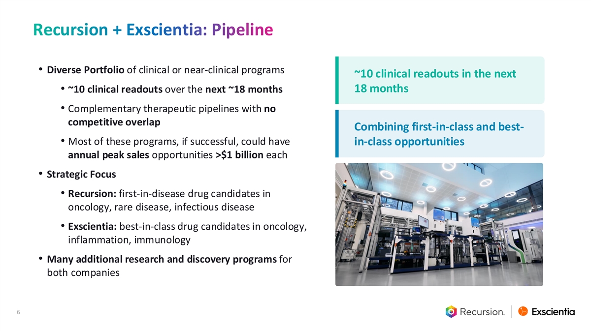 Recursion enters agreement with Exscientia to bring better medicines to patients more rapidly and more cost efficiently Combination of Many Complementary Factors • Pipeline: Diverse portfolio of clinical and near-clinical programs with ~10 clinical readouts over the next ~18 months • Partnerships: Diverse portfolio of transformational partnerships with potential for over $200 million in milestone payments over the next 2 years • Platform: Full-stack technology-enabled small molecule discovery platform • Business: ~$850 million in combined cash (end of Q2 2024), estimated annual synergies of ~$100 million or more and runway into 2027 • People: Shared vision to leverage technology & talent to discover and develop high quality medicines efficiently and at scale 5