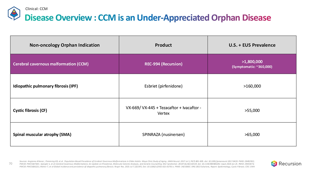 Clinical: CCM 70 Disease Overview : CCM is an Under-Appreciated Orphan Disease Non-oncology Orphan Indication Product U.S. + EU5 Prevalence >1,800,000 Cerebral cavernous malformation (CCM) REC-994 (Recursion) (Symptomatic: ~360,000) Idiopathic pulmonary fibrosis (IPF) Esbriet (pirfenidone) >160,000 VX-669/ VX-445 + Tezacaftor + Ivacaftor - Cystic fibrosis (CF) >55,000 Vertex Spinal muscular atrophy (SMA) SPINRAZA (nusinersen) >65,000 Sources: Angioma Alliance ; Flemming KD, et al . Population-Based Prevalence of Cerebral Cavernous Malformations in O lder Adults: Mayo Clinic Study of Aging. JAMA Neurol. 2017 Jul 1;74(7):801-805. doi: 10.1001/jamaneurol.2017.0439. PMID: 28492932; 70 PMCID: PMC5647645 ; Spiegler S, et al Cerebral Cavernous Malformations: An Update on Prevalence, Molecular Genetic Analyses, and Genetic Counselling. Mol Syndromol. 2018 Feb;9(2):60-69. doi: 10.1159/000486292. Epub 2018 Jan 25. PMID: 29593473; PMCID: PMC5836221; Maher T, et al Global incidence and prevalence of idiopathic pulmonary fibrosis. Respir Res. 2021 Jul 7;22(197). Doi: 10.1186/s12931-021-01791-z. PMID: 34233665. DRG 2022 Solutions, Report: Epidemiology, Cystic Fibrosis. CDC: SMA