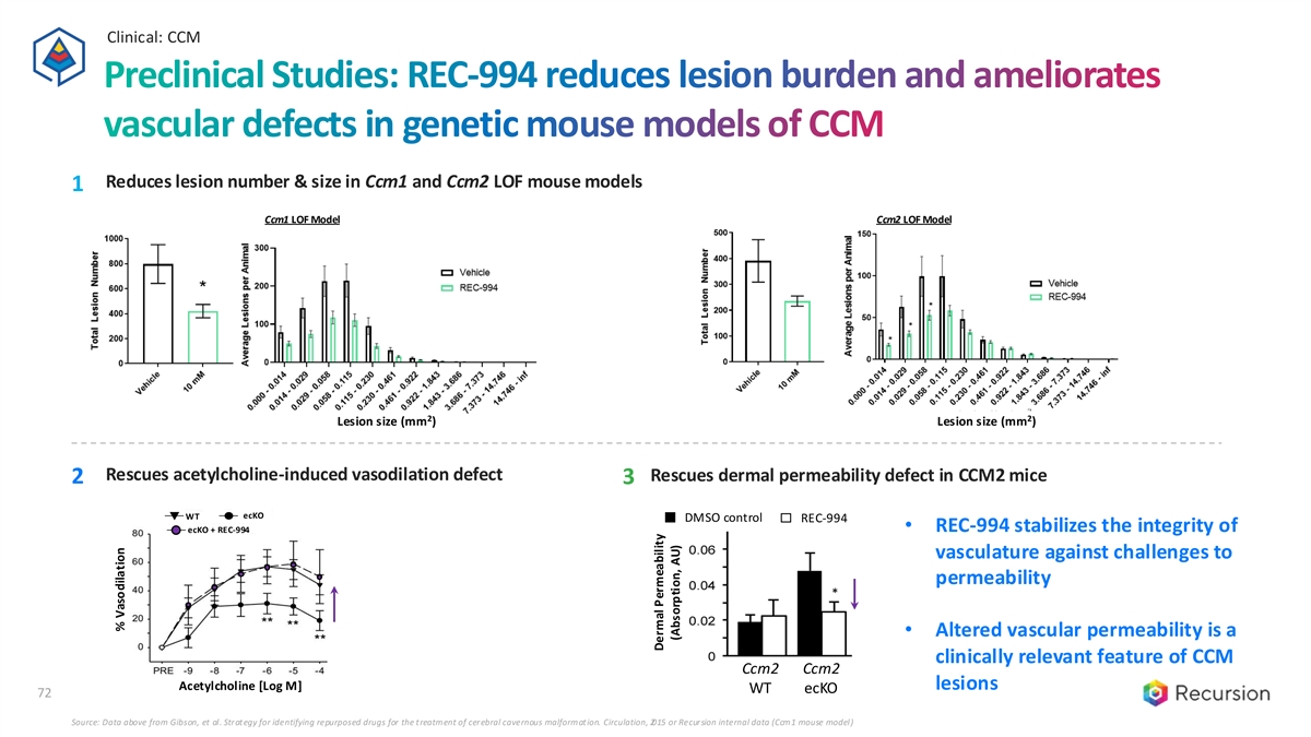 Clinical: CCM Preclinical Studies: REC-994 reduces lesion burden and ameliorates vascular defects in genetic mouse models of CCM Reduces lesion number & size in Ccm1 and Ccm2 LOF mouse models 1 Ccm1 LOF Model Ccm2 LOF Model * * * 2 2 Lesion size (mm ) Lesion size (mm ) Rescues acetylcholine-induced vasodilation defect Rescues dermal permeability defect in CCM2 mice 2 3 ecKO WT DMSO control REC-994 • REC-994 stabilizes the integrity of ecKO + REC-994 vasculature against challenges to permeability * • Altered vascular permeability is a clinically relevant feature of CCM Ccm2 Ccm2 lesions Acetylcholine [Log M] WT ecKO 72 Source: Data above from Gibson, et al. Strategy for identifying repurposed drugs for the treatment of cerebral cavernous malformation. Circulation, 2 015 or Recursion internal data (Ccm1 mouse model) % Vasodilation Dermal Permeability (Absorption, AU)
