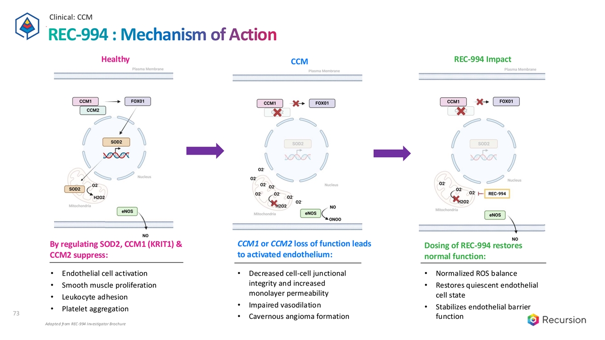 Clinical: CCM CCM – Applied prototyping of the Recursion OS siCTRL siCCM2 siCCM2 + REC-994 siCCM2 + Simvastatin siCCM2 + Cholecalciferol Using an early version of our Recursion OS in an academic setting, we identified about 39 molecules out of 2,100 screened that according to a machine learning classifier rescued a complex unbiased phenotype associated with CCM2 loss of function. Through a set of follow-on confirmatory assays of increasing complexity, REC-994 stood out as one of two compounds we tested in a 5-month chronic CCM animal model where both compounds demonstrated significant benefit. 71 Gibson, et al. Strategy for identifying repurposed drugs for the treatment of cerebral cavernous malformation. Circulation, 2 015