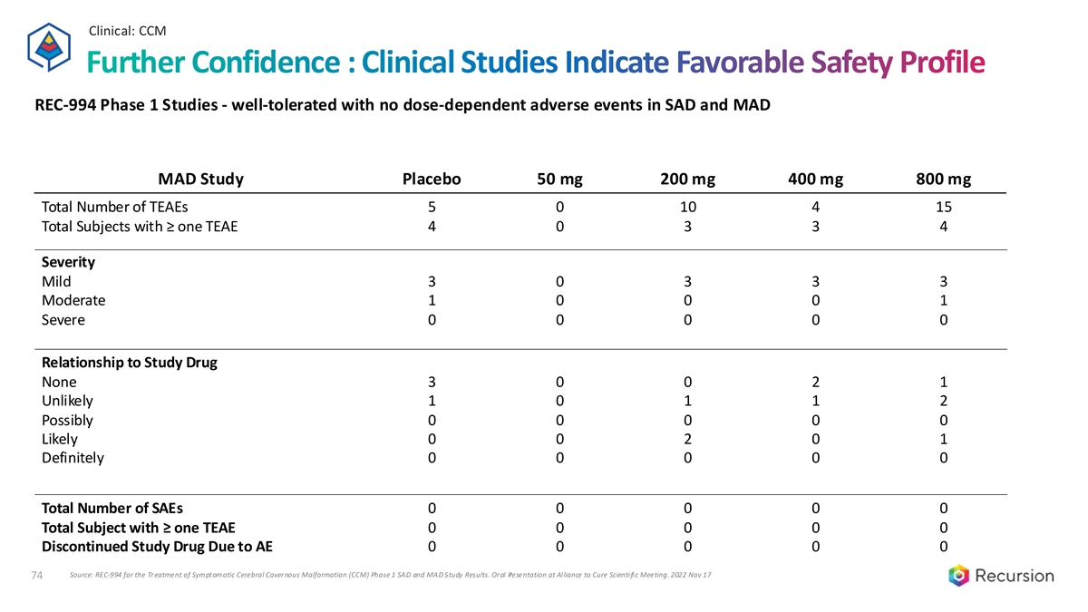 Clinical: CCM Further Confidence : Clinical Studies Indicate Favorable Safety Profile REC-994 Phase 1 Studies - well-tolerated with no dose-dependent adverse events in SAD and MAD MAD Study Placebo 50 mg 200 mg 400 mg 800 mg Total Number of TEAEs 5 0 10 4 15 Total Subjects with ≥ one TEAE 4 0 3 3 4 Severity Mild 3 0 3 3 3 Moderate 1 0 0 0 1 Severe 0 0 0 0 0 Relationship to Study Drug None 3 0 0 2 1 Unlikely 1 0 1 1 2 Possibly 0 0 0 0 0 Likely 0 0 2 0 1 Definitely 0 0 0 0 0 Total Number of SAEs 0 0 0 0 0 Total Subject with ≥ one TEAE 0 0 0 0 0 Discontinued Study Drug Due to AE 0 0 0 0 0 Source: REC-994 for the Treatment of Symptomatic Cerebral Cavernous Malformation (CCM) Phase 1 SAD and MAD Study Results. Oral P resentation at Alliance to Cure Scientific Meeting. 2022 Nov 17 74