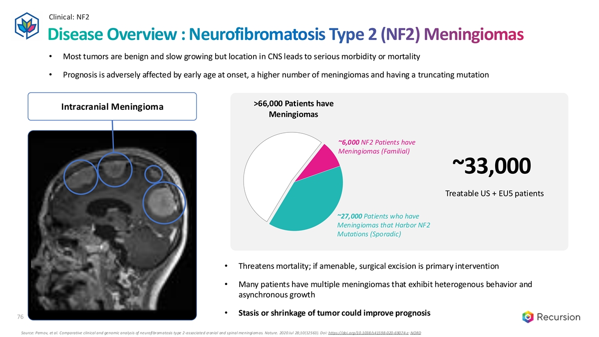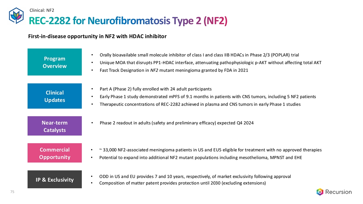 Clinical: NF2 REC-2282 for Neurofibromatosis Type 2 (NF2) First-in-disease opportunity in NF2 with HDAC inhibitor • Orally bioavailable small molecule inhibitor of class I and class IIB HDACs in Phase 2/3 (POPLAR) trial Program • Unique MOA that disrupts PP1-HDAC interface, attenuating pathophysiologic p-AKT without affecting total AKT Overview • Fast Track Designation in NF2 mutant meningioma granted by FDA in 2021 • Part A (Phase 2) fully enrolled with 24 adult participants Clinical • Early Phase 1 study demonstrated mPFS of 9.1 months in patients with CNS tumors, including 5 NF2 patients Updates • Therapeutic concentrations of REC-2282 achieved in plasma and CNS tumors in early Phase 1 studies • Phase 2 readout in adults (safety and preliminary efficacy) expected Q4 2024 Near-term Catalysts Commercial • ~ 33,000 NF2-associated meningioma patients in US and EU5 eligible for treatment with no approved therapies Opportunity • Potential to expand into additional NF2 mutant populations including mesothelioma, MPNST and EHE • ODD in US and EU provides 7 and 10 years, respectively, of market exclusivity following approval IP & Exclusivity • Composition of matter patent provides protection until 2030 (excluding extensions) 75
