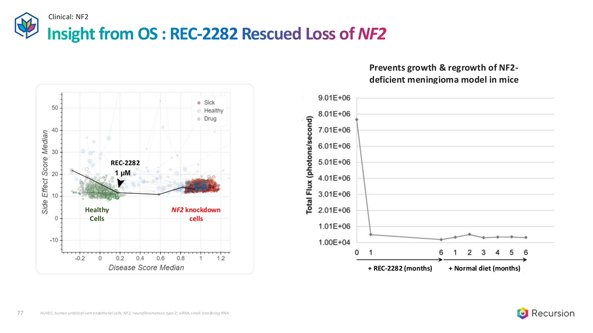Clinical: NF2 77 Insight from OS : REC-2282 Rescued Loss of NF2 Prevents growth & regrowth of NF2- deficient meningioma model in mice REC-2282 Healthy NF2 knockdown Cells cells + REC-2282 (months) + Normal diet (months) HUVEC, human umbilical vein endothelial cells; NF2, neurofibromatosis type 2; siRNA, small interfering RNA. 77
