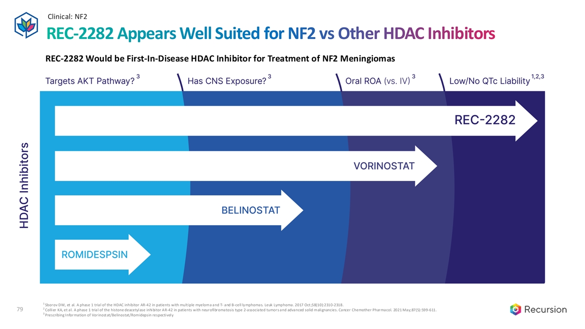 Clinical: NF2 79 REC-2282 Appears Well Suited for NF2 vs Other HDAC Inhibitors REC-2282 Would be First-In-Disease HDAC Inhibitor for Treatment of NF2 Meningiomas 1 Sborov DW, et al. A phase 1 trial of the HDAC inhibitor AR-42 in patients with multiple myeloma and T- and B-cell lymphomas. Leuk Lymphoma. 2017 Oct;58(10):2310-2318. 2 79 Collier KA, et al. A phase 1 trial of the histone deacetylase inhibitor AR-42 in patients with neurofibromatosis type 2-associated tumors and advanced solid malignancies. Cancer Chemother Pharmacol. 2021 May;87(5):599-611. 3 Prescribing Information of Vorinostat/Belinostat/Romidepsin respectively