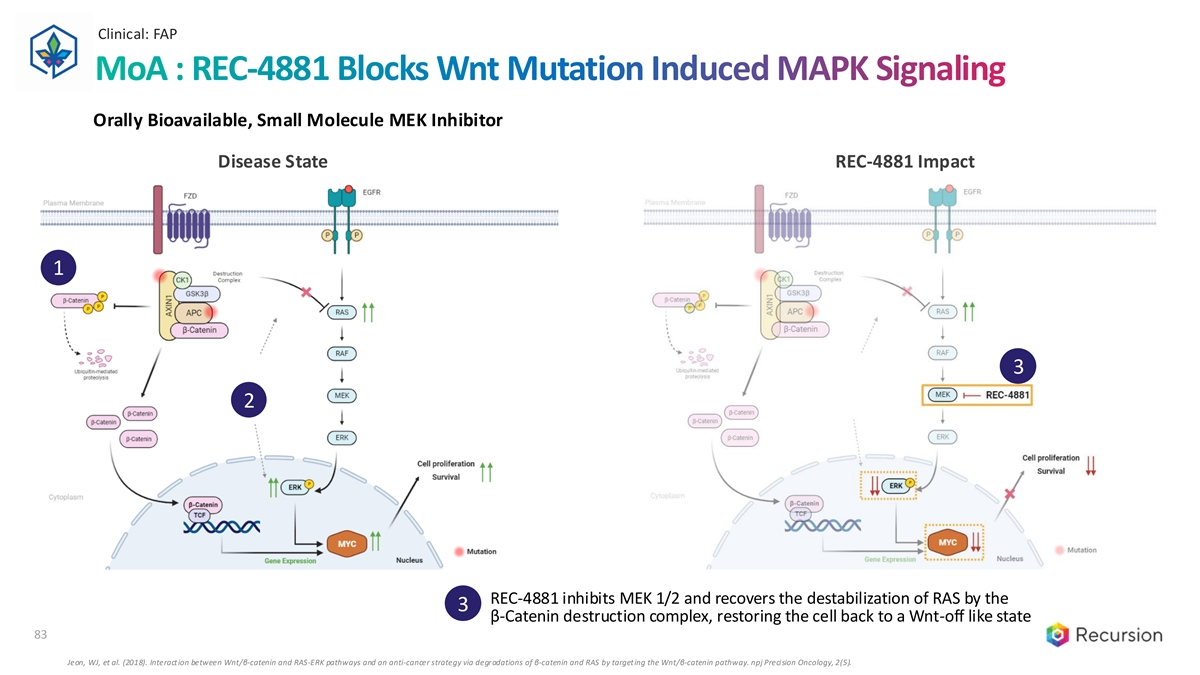 Clinical: FAP 83 MoA : REC-4881 Blocks Wnt Mutation Induced MAPK Signaling Orally Bioavailable, Small Molecule MEK Inhibitor Disease State REC-4881 Impact 1 3 2 REC-4881 inhibits MEK 1/2 and recovers the destabilization of RAS by the 3 β-Catenin destruction complex, restoring the cell back to a Wnt-off like state 83 Jeon, WJ, et al. (2018). Interaction between Wnt/β-catenin and RAS-ERK pathways and an anti-cancer strategy via degradations of β-catenin and RAS by targeting the Wnt/β-catenin pathway. npj Precision Oncology, 2(5).