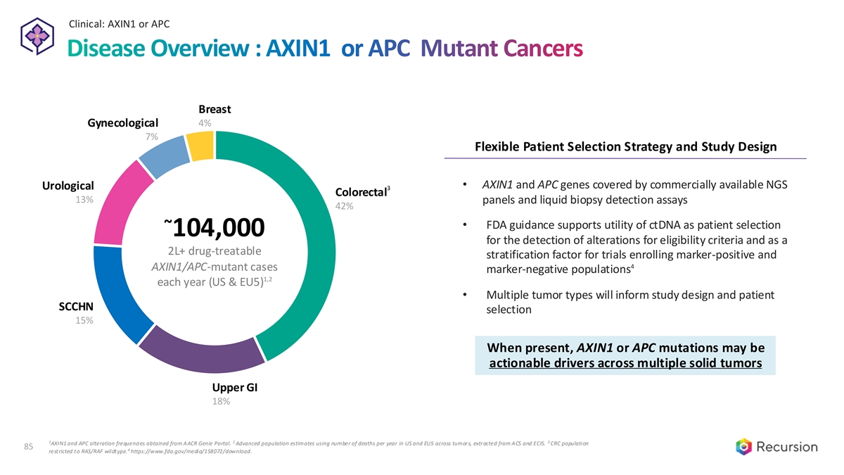Clinical: AXIN1 or APC REC-4881 for AXIN1 or APC Mutant Cancers First-in-disease opportunity in AXIN1 or APC mutant cancers with a MEK 1/2 inhibitor • Orally bioavailable, small molecule non-ATP competitive allosteric inhibitor of MEK 1/2 in Phase 2 (LILAC) Program • First therapeutic candidate advanced to a Phase 2 signal finding study in AXIN1 or APC mutant cancers Overview • Recursion’s first clinical trial in oncology and the first that used inferential search for hypothesis generation • Safety run-in of REC-4881 to identify RP2D prior to allocation Clinical • Protocol designed to assess activity in two independent cohorts of AXIN1 or APC mutant tumors Updates • Efficacy will evaluate ORR as measured by RECIST 1.1 • FPI achieved in Q1 2024 Near-term Catalysts • Phase 2 readout (safety, preliminary efficacy, and PK) anticipated H1 2025 Commercial • Diagnosed incidence of ~ 104,000 2L+ drug-treatable patients harboring AXIN1 or APC mutations in US and EU5 Opportunity • AXIN1 and APC genes covered by commercially available NGS panels and liquid biopsy detection assays • Method of use patent pending with protection until 2043 (excluding extensions) IP & Exclusivity • No known barriers to market access 84