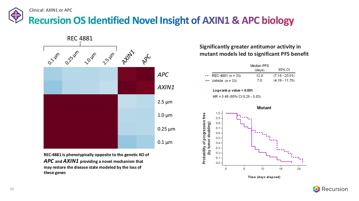 Clinical: AXIN1 or APC 86 Recursion OS Identified Novel Insight of AXIN1 & APC biology REC 4881 Significantly greater antitumor activity in mutant models led to significant PFS benefit APC AXIN1 2.5 µm 1.0 µm 0.25 µm 0.1 µm REC-4881 is phenotypically opposite to the genetic KO of APC and AXIN1 providing a novel mechanism that may restore the disease state modeled by the loss of these genes 86