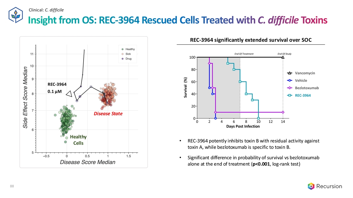 Clinical: C. difficile REC-3964 for Prevention of recurrent C. difficile infection (rCDI) Potential first-in-class small molecule for prevention of rCDI • Orally bioavailable, small molecule C. difficile toxin inhibitor and the first NCE developed by Recursion Program • Differentiated MOA selectively targets bacterial toxin while sparing the host to minimize adverse events Overview • Robust preclinical activity demonstrating superiority vs bezlotoxumab in the gold standard hamster model • Favorable safety and tolerability profile in Phase 1 dose-escalation with no DLTs and no SAEs Clinical • Minimal adverse events seen in Phase 1, and all deemed Grade 1 Updates • BID dosing provides therapeutic exposures expected to reach targeted trough concentrations Near-term • Phase 2 proof-of-concept study planned for initiation in Q4 2024 Catalysts • Preliminary readout expected YE 2025 Commercial • > 100,000 high-risk rCDI patients in US and EU5 with limited treatment options to prevent recurrent disease Opportunity • Ability to address populations not eligible for FMT or microbiome-based therapies due to comorbidities • Composition of matter patent allowed with protection until 2042 (excluding extensions) IP & Exclusivity • No known barriers to market access 87