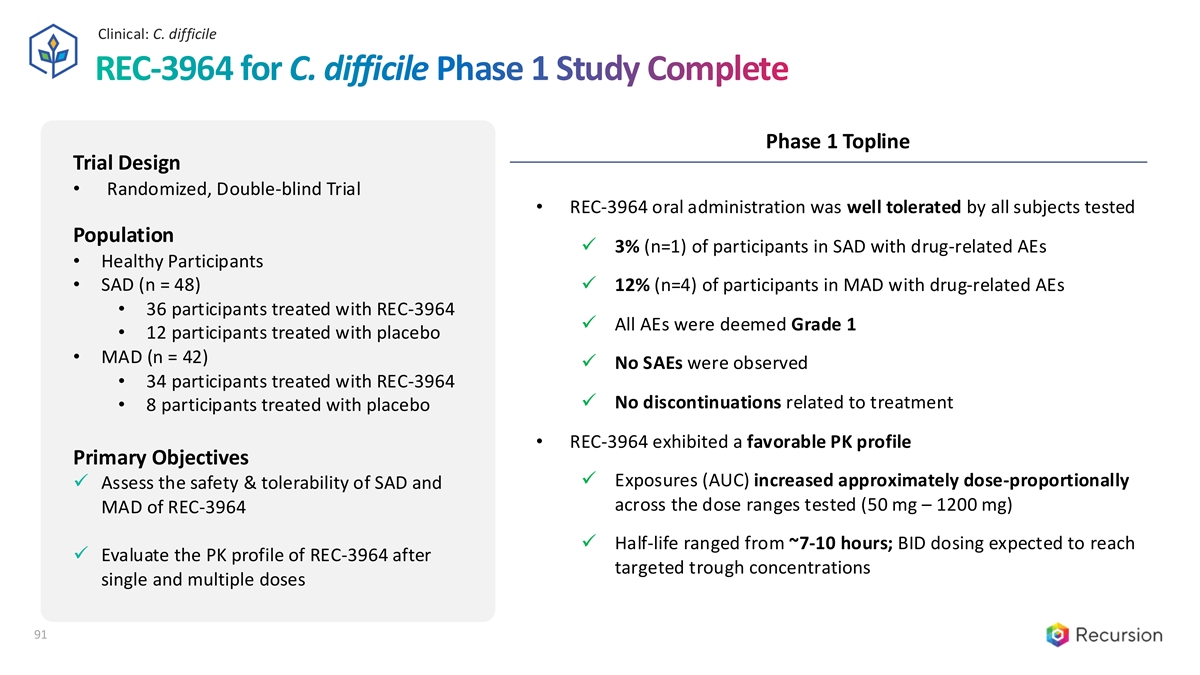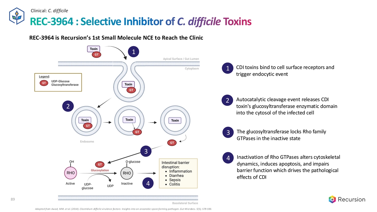 Clinical: C. difficile REC-3964 : Selective Inhibitor of C. difficile Toxins REC-3964 is Recursion’s 1st Small Molecule NCE to Reach the Clinic 1 2 5 3 REC-3964 binds and blocks 5 catalytic activity of the toxin’s innate glucosyltransferase, but not 4 the host's 90 Adapted from Awad, MM. et al. (2014). Clostridium difficile virulence factors: Insights into an anaerobic spore-forming pathogen. Gut Microbes. 5(5), 579-593.