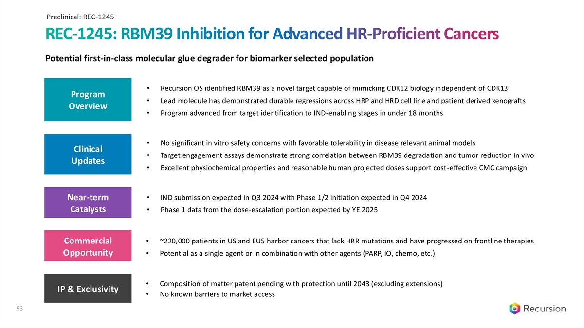 Preclinical: REC-1245 REC-1245: RBM39 Inhibition for Advanced HR-Proficient Cancers Potential first-in-class molecular glue degrader for biomarker selected population • Recursion OS identified RBM39 as a novel target capable of mimicking CDK12 biology independent of CDK13 Program • Lead molecule has demonstrated durable regressions across HRP and HRD cell line and patient derived xenografts Overview • Program advanced from target identification to IND-enabling stages in under 18 months • No significant in vitro safety concerns with favorable tolerability in disease relevant animal models Clinical • Target engagement assays demonstrate strong correlation between RBM39 degradation and tumor reduction in vivo Updates • Excellent physiochemical properties and reasonable human projected doses support cost-effective CMC campaign • IND submission expected in Q3 2024 with Phase 1/2 initiation expected in Q4 2024 Near-term Catalysts • Phase 1 data from the dose-escalation portion expected by YE 2025 Commercial • ~220,000 patients in US and EU5 harbor cancers that lack HRR mutations and have progressed on frontline therapies Opportunity • Potential as a single agent or in combination with other agents (PARP, IO, chemo, etc.) • Composition of matter patent pending with protection until 2043 (excluding extensions) IP & Exclusivity • No known barriers to market access 93