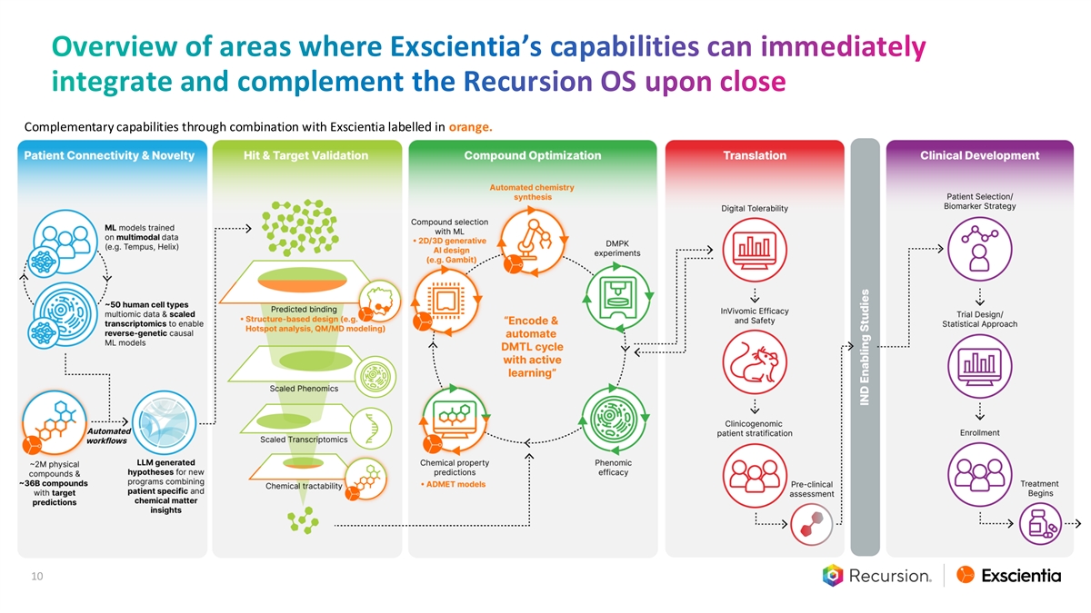 Recursion + Exscientia: Platform • Core Strengths • Recursion: scaled biology exploration and translational capabilities primarily focused on first-in- disease opportunities • Exscientia: precision chemistry design and small molecule automated synthesis primarily focused on best-in-class opportunities • Assembles a full-stack platform spanning • Patient-centric target discovery • Hit discovery and lead optimization • Automated chemical synthesis • Predictive ADMET and translation • Biomarker selection • Clinical development 9