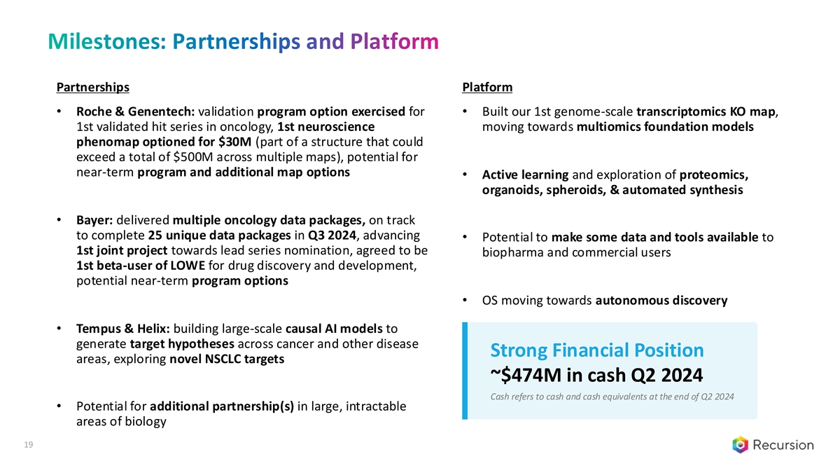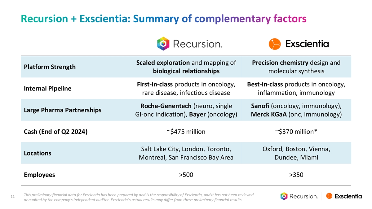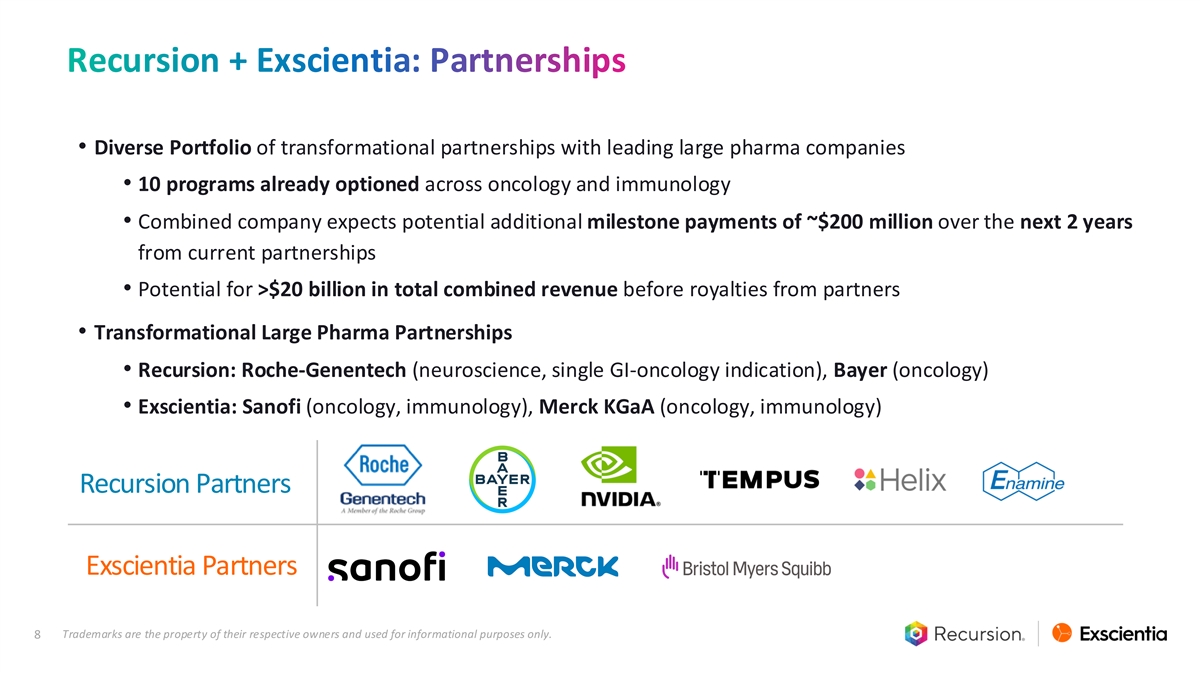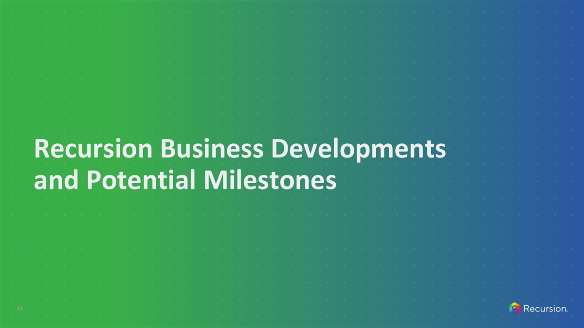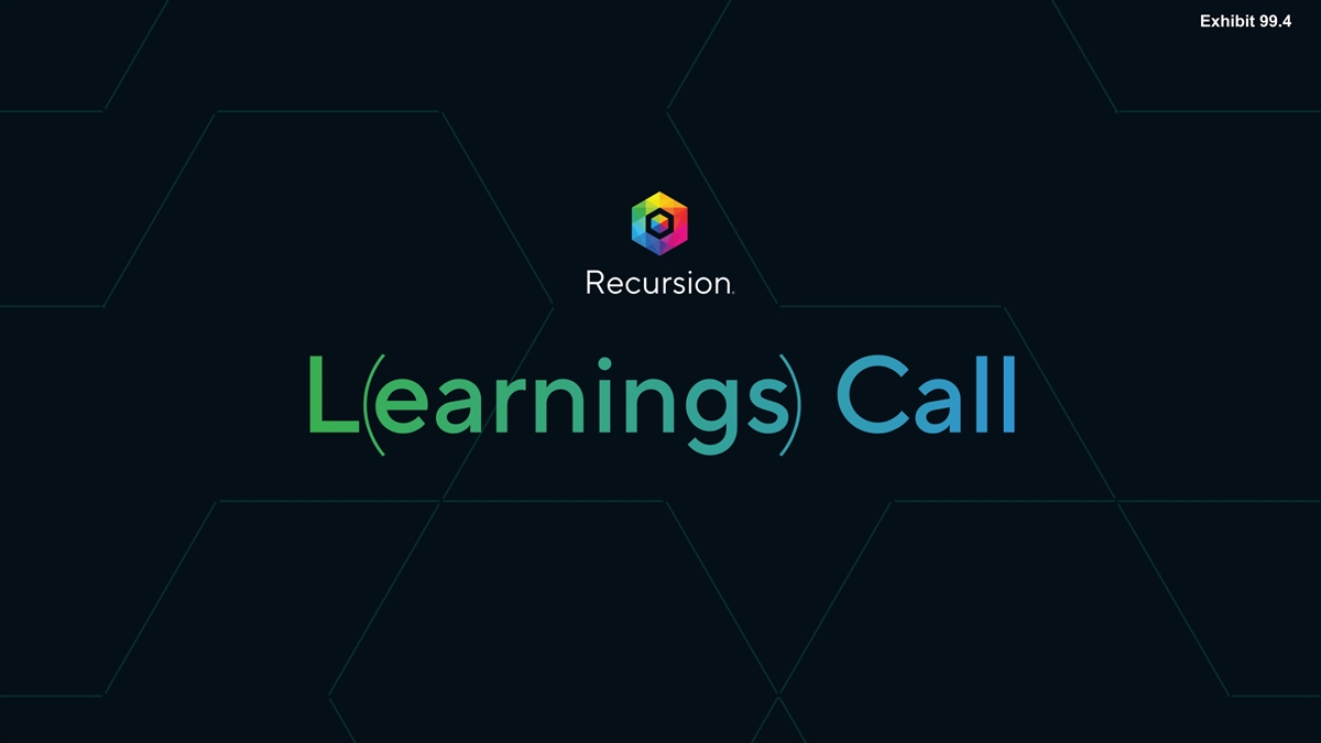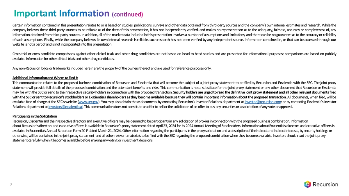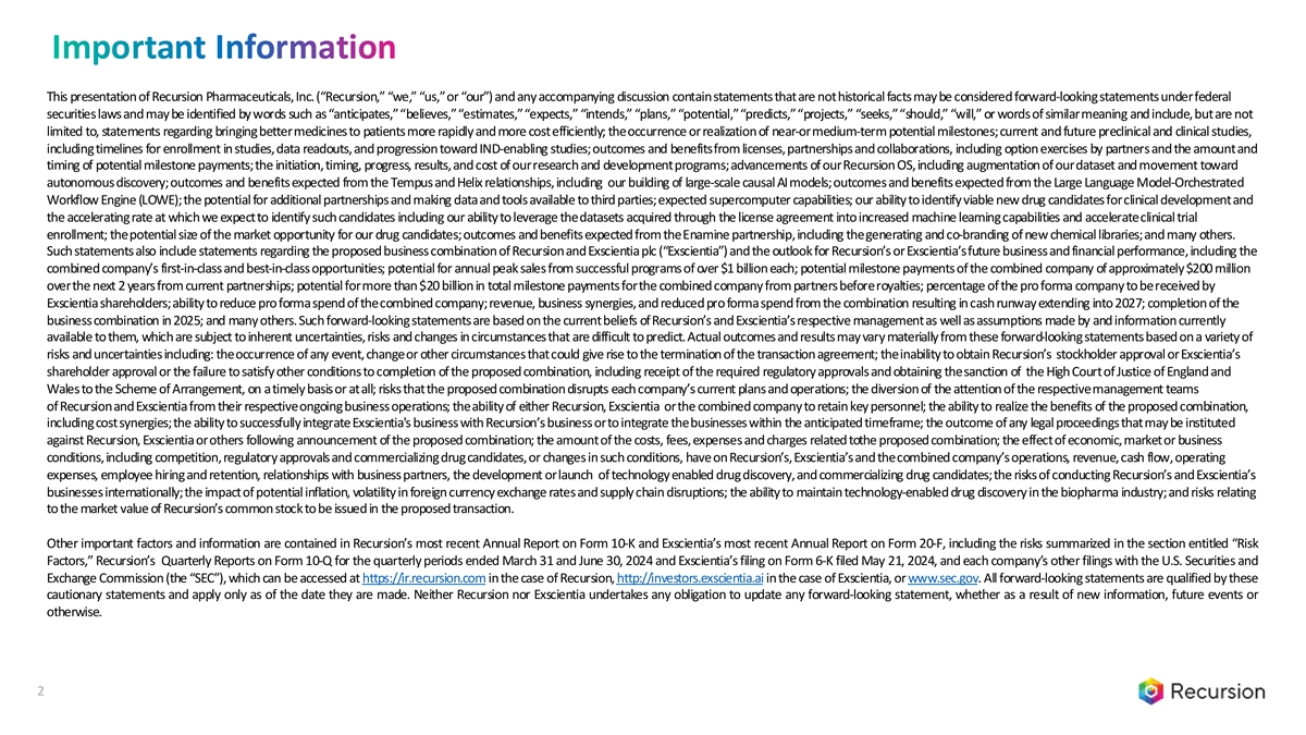 Important Information This presentation of Recursion Pharmaceuticals, Inc. (“Recursion,” “we,” “us,” or “our”) and any accompanying discussion contain statements that are not historical facts may be considered forward-looking statements under federal securities laws and may be identified by words such as “anticipates,” “believes,” “estimates,” “expects,” “intends,” “plans,” “potential,” “predicts,” “projects,” “seeks,” “should,” “will,” or words of similar meaning and include, but are not limited to, statements regarding bringing better medicines to patients more rapidly and more cost efficiently; the occurrence or realization of near-or medium-term potential milestones; current and future preclinical and clinical studies, including timelines for enrollment in studies, data readouts, and progression toward IND-enabling studies; outcomes and benefits from licenses, partnerships and collaborations, including option exercises by partners and the amount and timing of potential milestone payments; the initiation, timing, progress, results, and cost of our research and development programs; advancements of our Recursion OS, including augmentation of our dataset and movement toward autonomous discovery; outcomes and benefits expected from the Tempus and Helix relationships, including our building of large-scale causal AI models; outcomes and benefits expected from the Large Language Model-Orchestrated Workflow Engine (LOWE); the potential for additional partnerships and making data and tools available to third parties; expected supercomputer capabilities; our ability to identify viable new drug candidates for clinical development and the accelerating rate at which we expect to identify such candidates including our ability to leverage the datasets acquired through the license agreement into increased machine learning capabilities and accelerate clinical trial enrollment; the potential size of the market opportunity for our drug candidates; outcomes and benefits expected from the Enamine partnership, including the generating and co-branding of new chemical libraries; and many others. Such statements also include statements regarding the proposed business combination of Recursionand Exscientia plc (“Exscientia”) and the outlook for Recursion’s or Exscientia’s future business and financial performance, including the combined company’s first-in-class and best-in-class opportunities; potential for annual peak sales from successful programs of over $1 billion each; potential milestone payments of the combined company of approximately $200 million over the next 2 years from current partnerships; potential for more than $20 billion in total milestone payments for the combined company from partners before royalties; percentage of the pro forma company to be received by Exscientia shareholders; ability to reduce pro forma spend of the combined company; revenue, business synergies, and reduced pro forma spend from the combination resulting in cash runway extending into 2027; completion of the business combination in 2025; and many others. Such forward-looking statements are based on the current beliefs ofRecursion’s and Exscientia’s respective management as well as assumptions made by and information currently available to them, which are subject to inherent uncertainties, risks and changes in circumstances that are difficult to predict. Actual outcomes and results may vary materially from these forward-looking statements based on a variety of risks and uncertainties including: the occurrence of any event, change or other circumstances that could give rise to the termination of the transaction agreement; the inability to obtain Recursion’s stockholder approval or Exscientia’s shareholder approval or the failure to satisfy other conditions to completion of the proposed combination, including receipt of the required regulatory approvals and obtaining the sanction of the High Court of Justice of England and Wales to the Scheme of Arrangement, on a timely basis or at all; risks that the proposed combination disrupts each company’s current plans and operations; the diversion of the attention of the respective management teams ofRecursionand Exscientia from their respective ongoing business operations; the ability of either Recursion, Exscientia or the combined company to retain key personnel; the ability to realize the benefits of the proposed combination, including cost synergies; the ability to successfully integrate Exscientia's business with Recursion’s business or to integrate the businesses within the anticipated timeframe; the outcome of any legal proceedings that may be instituted against Recursion, Exscientia or others following announcement of the proposed combination; the amount of the costs, fees, expenses and charges related toth e proposed combination; the effect of economic, market or business conditions, including competition, regulatory approvals and commercializing drug candidates, or changes in such conditions, have onRecursion’s,Exscientia’s and the combined company’s operations, revenue, cash flow, operating expenses, employee hiring and retention, relationships with business partners, the development or launch of technology enabled drug discovery, and commercializing drug candidates; the risks of conducting Recursion’s and Exscientia’s businesses internationally; the impact of potential inflation, volatility in foreign currency exchange rates and supply chain disruptions; the ability to maintain technology-enabled drug discovery in the biopharma industry; and risks relating to the market value of Recursion’s common stock to be issued in the proposed transaction. Other important factors and information are contained in Recursion’s most recent Annual Report on Form 10-K and Exscientia’s most recent Annual Report on Form 20-F, including the risks summarized in the section entitled “Risk Fa