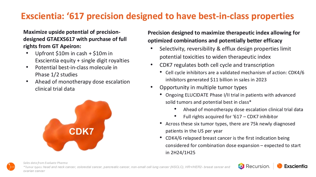 Exscientia: ‘617 precision designed to have best-in-class properties Maximize upside potential of precision- Precision designed to maximize therapeutic index allowing for designed GTAEXS617 with purchase of full optimized combinations and potentially better efficacy rights from GT Apeiron: • Selectivity, reversibility & efflux design properties limit • Upfront $10m in cash + $10m in potential toxicities to widen therapeutic index Exscientia equity + single digit royalties • CDK7 regulates both cell cycle and transcription • Potential best-in-class molecule in • Cell cycle inhibitors are a validated mechanism of action: CDK4/6 Phase 1/2 studies inhibitors generated $11 billion in sales in 2023 • Ahead of monotherapy dose escalation • Opportunity in multiple tumor types clinical trial data • Ongoing ELUCIDATE Phase I/II trial in patients with advanced solid tumors and potential best in class* • Ahead of monotherapy dose escalation clinical trial data • Full rights acquired for ‘617 – CDK7 inhibitor • Across these six tumor types, there are 75k newly diagnosed patients in the US per year CDK7 • CDK4/6 relapsed breast cancer is the first indication being considered for combination dose expansion – expected to start in 2H24/1H25 Sales data from Evaluate Pharma *Tumor types: head and neck cancer, colorectal cancer, pancreatic cancer, non-small cell lung cancer (NSCLC), HR+/HER2- breast cancer and ovarian cancer