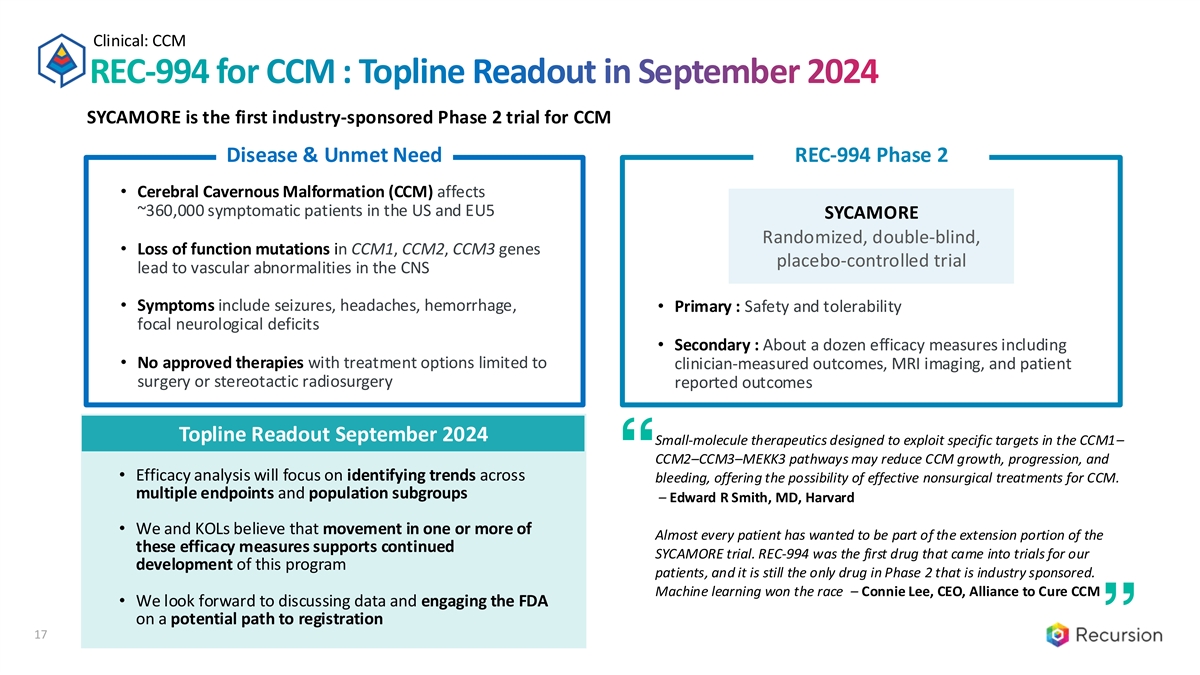 Milestones: Pipeline – 7 Clinical Trial Readouts Expected in ~18 Months Pipeline • CCM: Ph2 readout expected in September 2024 • NF2: Ph2 safety & preliminary efficacy expected in Q4 2024 • FAP: Ph2 safety & preliminary efficacy expected in H1 2025 • AXIN1 or APC Mutant Cancers: Ph2 safety & preliminary efficacy expected in H1 2025 • C. difficile Infection: Ph2 initiation expected in Q4 2024 with preliminary readout expected by end of 2025 • Advanced HR-Proficient Cancers, Target RBM39: IND submission expected in Q3 2024. Ph1/2 initiation expected in Q4 2024 with Ph1 dose-escalation readout by end of 2025 • Target Epsilon (novel target in fibrotic diseases): IND submission expected in early 2025 with Ph1 healthy volunteer readout by end of 2025 • Dozens of internal & partner programs in early stages with first LLM & causal model driven programs entering pipeline 18
