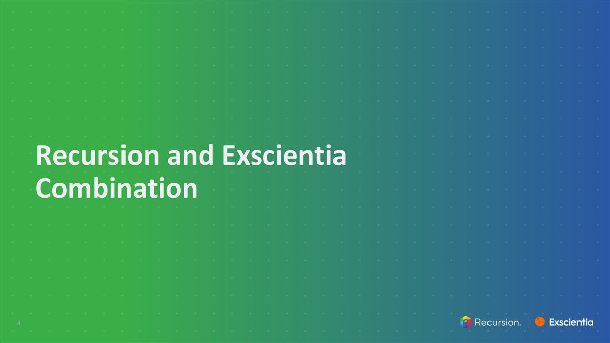 Important Information (continued) Certain information contained in this presentation relates to or is based on studies, publications, surveys and other data obtained from third-party sources and the company’s own internal estimates and research. While the company believes these third-party sources to be reliable as of the date of this presentation, it has not independently verified, and makes no representation as to the adequacy, fairness, accuracy or completeness of, any information obtained from third-party sources. In addition, all of the market data included in this presentation involves a number of assumptions and limitations, and there can be no guarantee as to the accuracy or reliability of such assumptions. Finally, while the company believes its own internal research is reliable, such research has not been verified by any independent source. Information contained in, or that can be accessed through our website is not a part of and is not incorporated into this presentation. Cross-trial or cross-candidate comparisons against other clinical trials and other drug candidates are not based on head-to-head studies and are presented for informational purposes; comparisons are based on publicly available information for other clinical trials and other drug candidates. Any non-Recursion logos or trademarks included herein are the property of the owners thereof and are used for reference purposes only. Additional Information and Where to Find It This communication relates to the proposed business combination of Recursion and Exscientia that will become the subject of a joint proxy statement to be filed by Recursion and Exscientia with the SEC. The joint proxy statement will provide full details of the proposed combination and the attendant benefits and risks. This communication is not a substitute for the joint proxy statement or any other document that Recursion or Exscientia may file with the SEC or send to their respective security holders in connection with the proposed transaction. Security holders are urged to read the definitive joint proxy statement and all other relevant documents filed with the SEC or sent toRecursion’s stockholders or Exscientia’s shareholders as they become available because they will contain important information about the proposed transaction. All documents, when filed, will be available free of charge at the SEC’s website (www.sec.gov). You may also obtain these documents by contacting Recursion’s Investor Relations department at investor@recursion.com; or by contacting Exscientia’s Investor Relations department at investors@exscientia.ai. This communication does not constitute an offer to sell or the solicitation of an offer to buy any securities or a solicitation of any vote or approval. Participants in the Solicitation Recursion,Exscientia and their respective directors and executive officers may be deemed to be participants in any solicitation of proxies in connection with the proposed business combination. Information about Recursion’sdirectors and executive officers is available in Recursion’s proxy statement dated April 23, 2024 for its 2024 Annual Meeting of Stockholders. Information about Exscientia’s directors and executive officers is available in Exscientia’s Annual Report on Form 20-F dated March 21, 2024. Other information regarding the participants in the proxy solicitation and a description of their direct and indirect interests, by security holdings or otherwise, will be contained in the joint proxy statement and all other relevant materials to be filed with the SEC regarding the proposed combination when they become available. Investors should read the joint proxy statement carefully when it becomes available before making any voting or investment decisions. 3