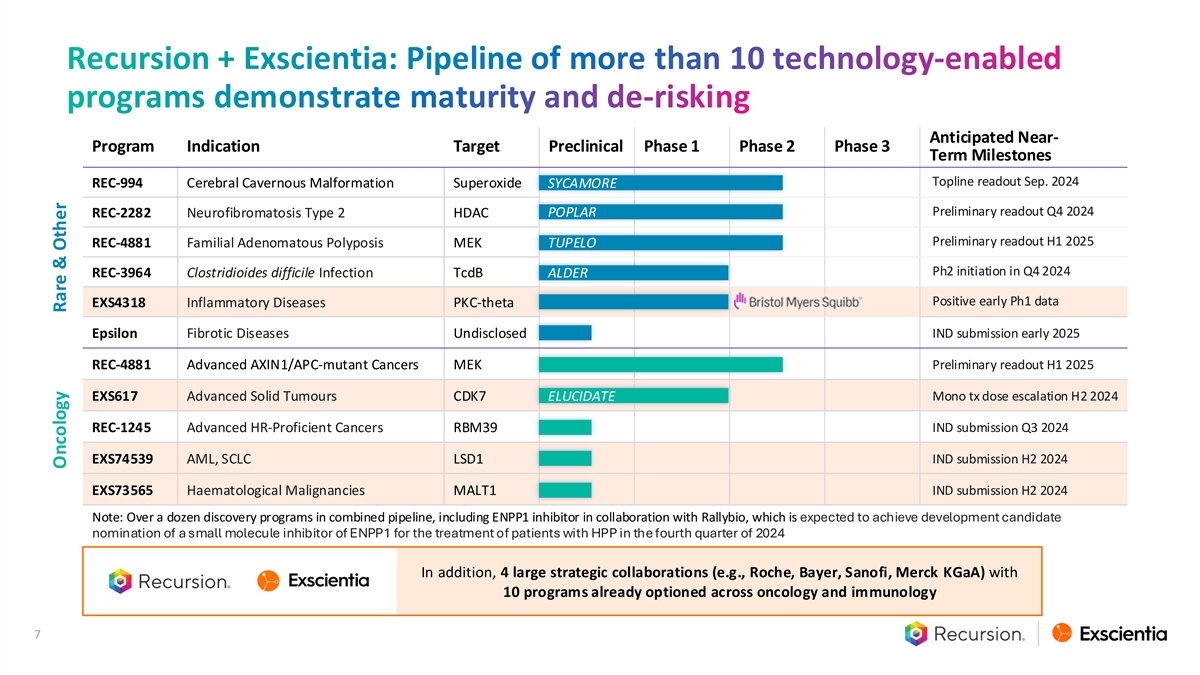 Recursion + Exscientia: Pipeline • Diverse Portfolio of clinical or near-clinical programs ~10 clinical readouts in the next 18 months • ~10 clinical readouts over the next ~18 months • Complementary therapeutic pipelines with no competitive overlap Combining first-in-class and best- • Most of these programs, if successful, could have in-class opportunities annual peak sales opportunities >$1 billion each • Strategic Focus • Recursion: first-in-disease drug candidates in oncology, rare disease, infectious disease • Exscientia: best-in-class drug candidates in oncology, inflammation, immunology • Many additional research and discovery programs for both companies 6