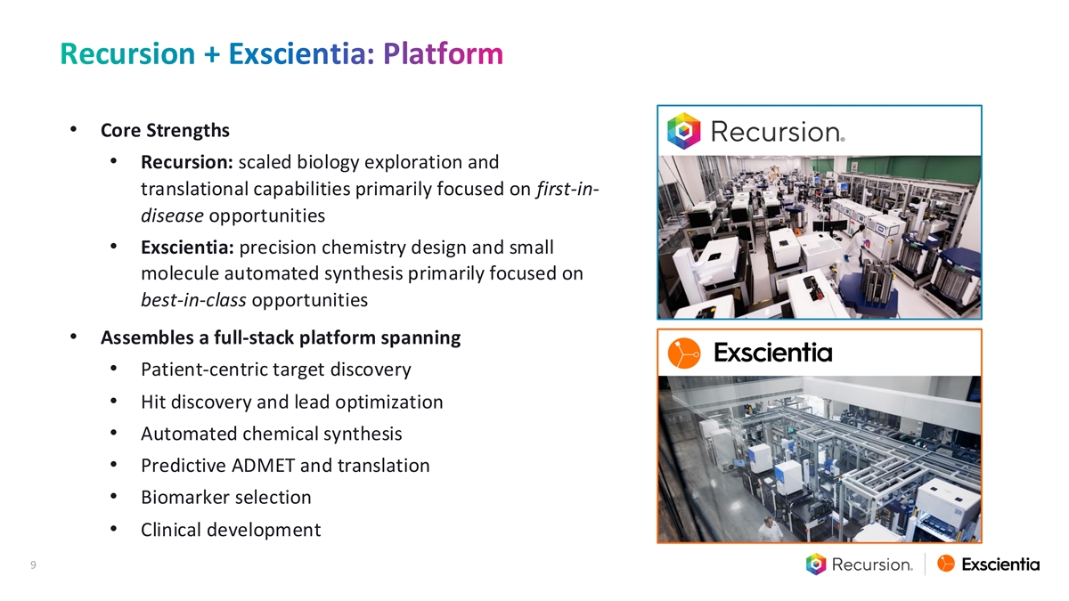 Recursion + Exscientia: Partnerships • Diverse Portfolio of transformational partnerships with leading large pharma companies • 10 programs already optioned across oncology and immunology • Combined company expects potential additional milestone payments of ~$200 million over the next 2 years from current partnerships • Potential for >$20 billion in total combined revenue before royalties from partners • Transformational Large Pharma Partnerships • Recursion: Roche-Genentech (neuroscience, single GI-oncology indication), Bayer (oncology) • Exscientia: Sanofi (oncology, immunology), Merck KGaA (oncology, immunology) Recursion Partners Exscientia Partners 8 Trademarks are the property of their respective owners and used for informational purposes only.
