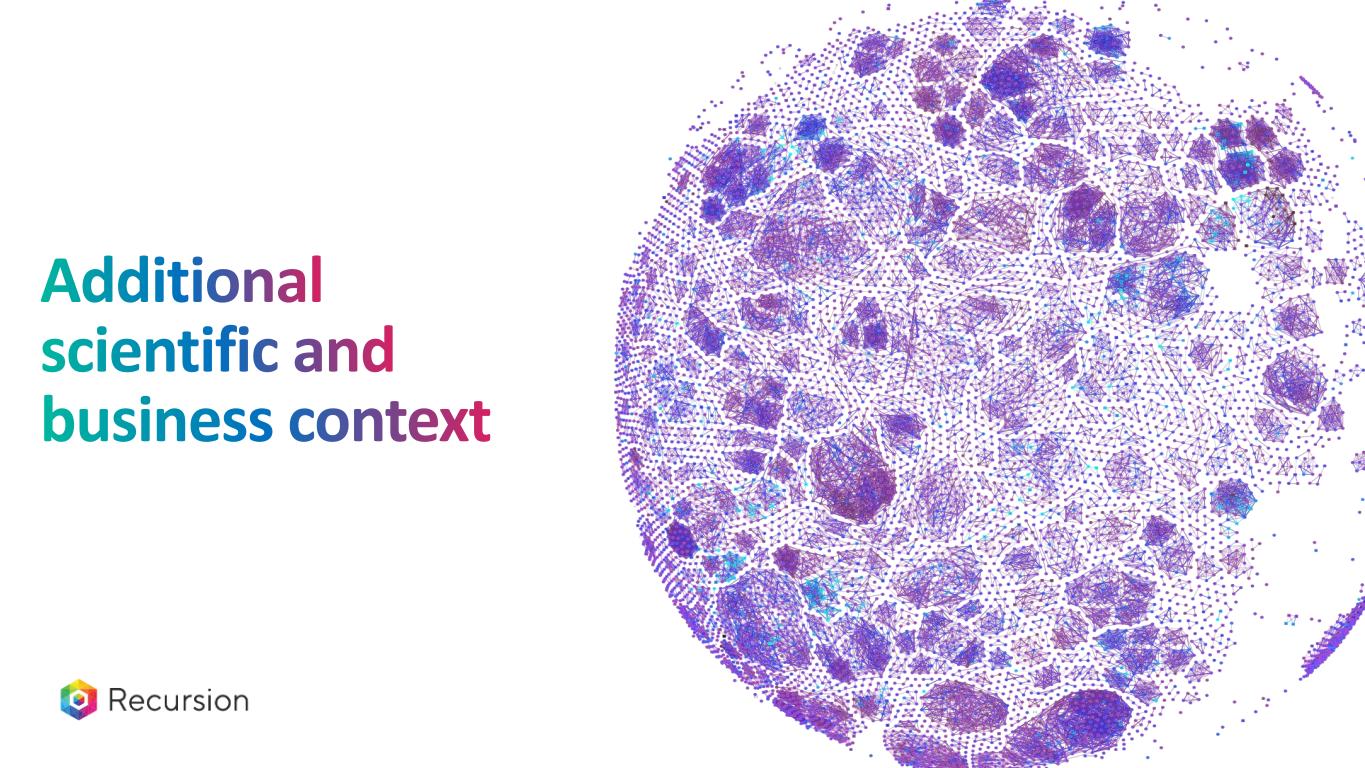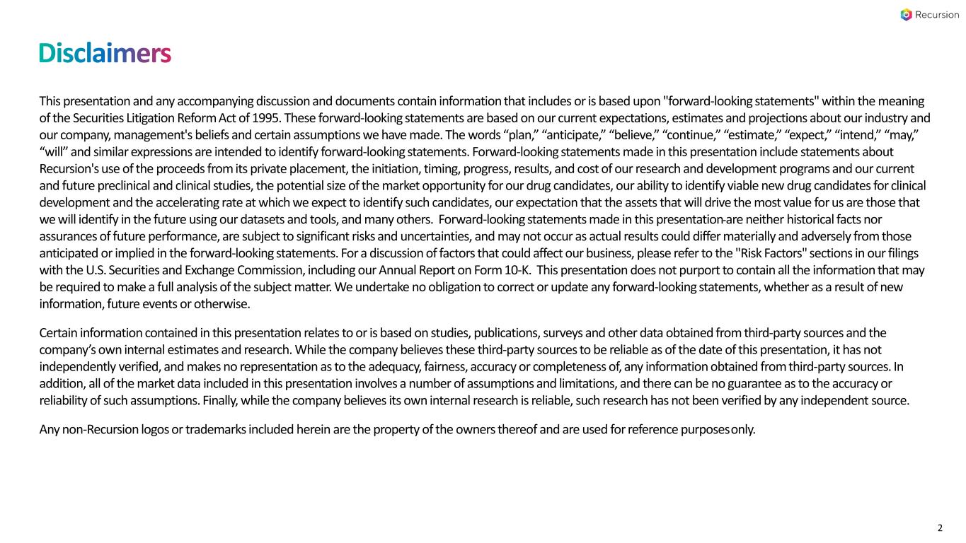 This presentation and any accompanying discussion and documents contain information that includes or is based upon "forward-looking statements" within the meaning of the Securities Litigation Reform Act of 1995. These forward-looking statements are based on our current expectations, estimates and projections about our industry and our company, management's beliefs and certain assumptions we have made. The words “plan,” “anticipate,” “believe,” “continue,” “estimate,” “expect,” “intend,” “may,” “will” and similar expressions are intended to identify forward-looking statements. Forward-looking statements made in this presentation include statements about Recursion's use of the proceeds from its private placement, the initiation, timing, progress, results, and cost of our research and development programs and our current and future preclinical and clinical studies, the potential size of the market opportunity for our drug candidates, our ability to identify viable new drug candidates for clinical development and the accelerating rate at which we expect to identify such candidates, our expectation that the assets that will drive the most value for us are those that we will identify in the future using our datasets and tools, and many others. Forward-looking statements made in this presentation are neither historical facts nor assurances of future performance, are subject to significant risks and uncertainties, and may not occur as actual results could differ materially and adversely from those anticipated or implied in the forward-looking statements. For a discussion of factors that could affect our business, please refer to the "Risk Factors" sections in our filings with the U.S. Securities and Exchange Commission, including our Annual Report on Form 10-K. This presentation does not purport to contain all the information that may be required to make a full analysis of the subject matter. We undertake no obligation to correct or update any forward-looking statements, whether as a result of new information, future events or otherwise. Certain information contained in this presentation relates to or is based on studies, publications, surveys and other data obtained from third-party sources and the company’s own internal estimates and research. While the company believes these third-party sources to be reliable as of the date of this presentation, it has not independently verified, and makes no representation as to the adequacy, fairness, accuracy or completeness of, any information obtained from third-party sources. In addition, all of the market data included in this presentation involves a number of assumptions and limitations, and there can be no guarantee as to the accuracy or reliability of such assumptions. Finally, while the company believes its own internal research is reliable, such research has not been verified by any independent source. Any non-Recursion logos or trademarks included herein are the property of the owners thereof and are used for reference purposesonly. 2