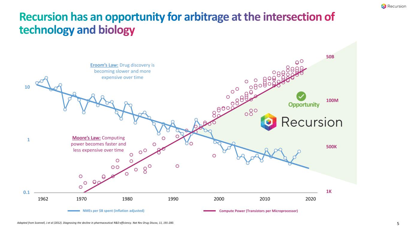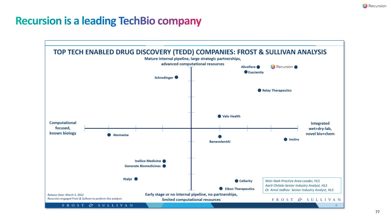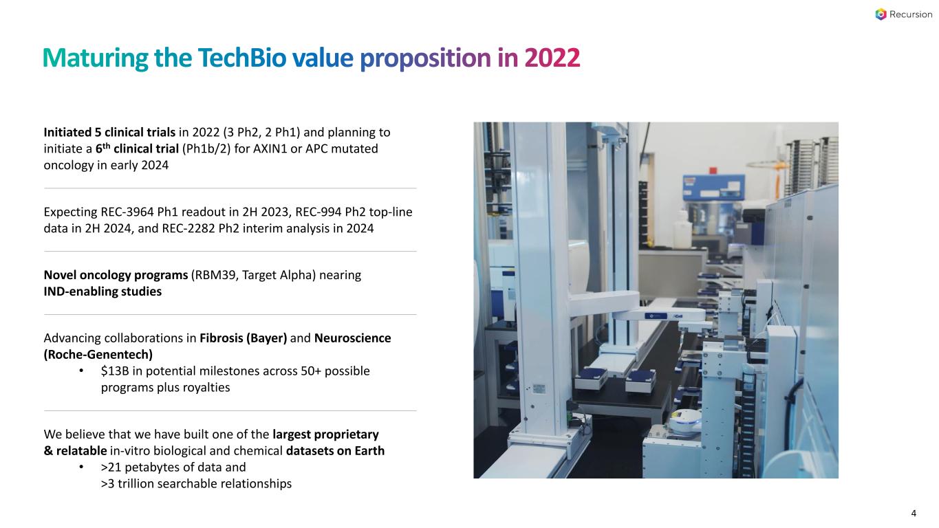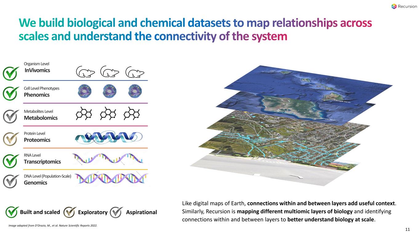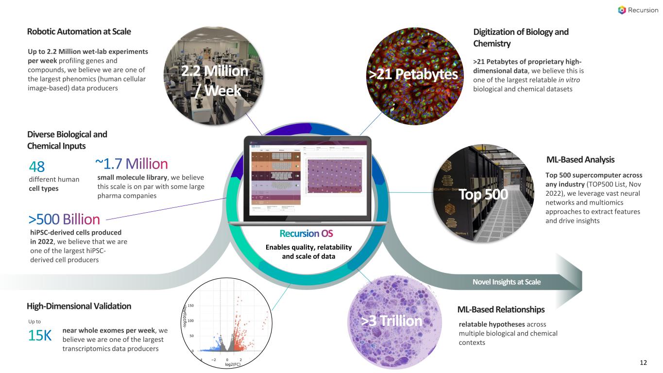 different human cell types small molecule library, we believe this scale is on par with some large pharma companies hiPSC-derived cells produced in 2022, we believe that we are one of the largest hiPSC- derived cell producers Diverse Biological and Chemical Inputs Robotic Automation at Scale Up to 2.2 Million wet-lab experiments per week profiling genes and compounds, we believe we are one of the largest phenomics (human cellular image-based) data producers Digitization of Biology and Chemistry >21 Petabytes of proprietary high- dimensional data, we believe this is one of the largest relatable in vitro biological and chemical datasets ML-Based Analysis Top 500 supercomputer across any industry (TOP500 List, Nov 2022), we leverage vast neural networks and multiomics approaches to extract features and drive insights relatable hypotheses across multiple biological and chemical contexts ML-Based RelationshipsHigh-Dimensional Validation Up to 12 Top 500 >21 Petabytes2.2 Million / Week near whole exomes per week, we believe we are one of the largest transcriptomics data producers >3 Trillion Novel Insights at Scale Enables quality, relatability and scale of data