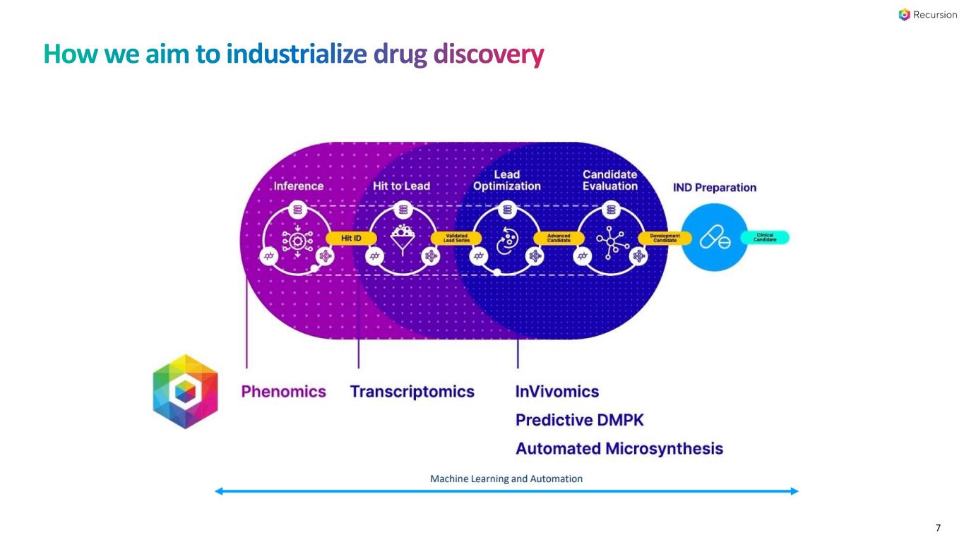 Platforms drive discovery. Unbiased & target agnostic Literature drives discovery. Informs target-based hypotheses Data are our fuel. Shape our hypotheses Data are an exhaust. Limited to testing hypotheses Virtuous cycles of atoms & bits. Iterative feedback accelerates learning Linear process. Little cross-program learning or iteration Connected data across programs. Relatable high-dimensional data Disparate data generation. Siloed to individual programs and diseases Industrialized to scale. Automation & standardization Bespoke processes. Low-dimensional assays & biomarkers 6