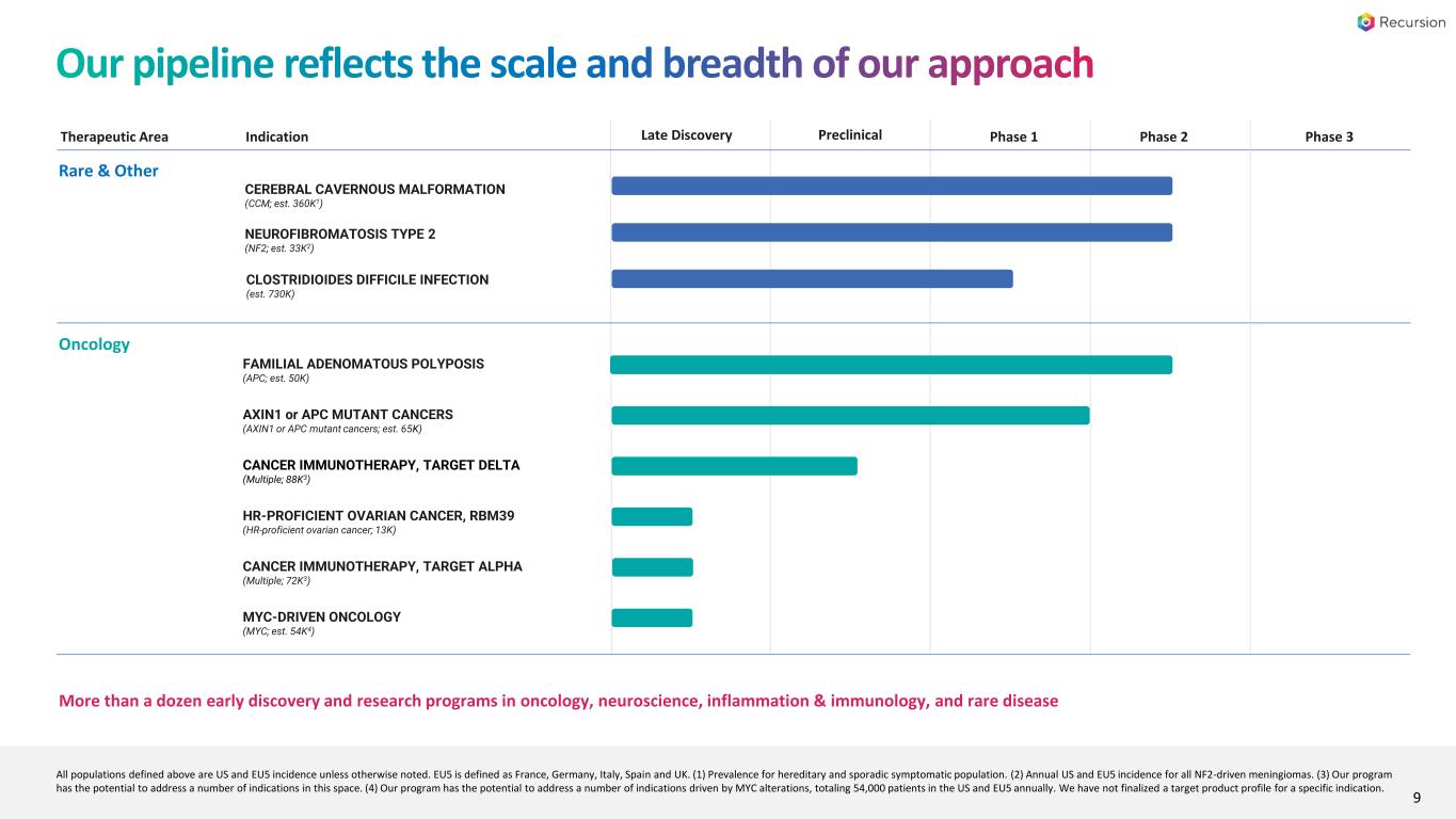 Data shown is the average of all our programs since late 2017. All industry data adapted from Paul, et al. Nature Reviews Drug Discovery. (2010) 9, 203–214 8 Screen — Hit ID — Validated Lead — Advanced Candidate — Development Candidate — Industry Recursion Failing faster and earlier to › › spend less › C o st t o IN D ( $ M ) 25 — 20 — 15 — 10 — 5 — 0 — Industry 40 — 30 — 20 — 10 — 0 — › and go faster 100 80 60 51 80% 75% 85% 100 64 25 64% 39% 62% 12 50% St ag e Ti m e t o V al id at ed L e ad ( m o ) Recursion Industry Recursion 8 Industry Recursion