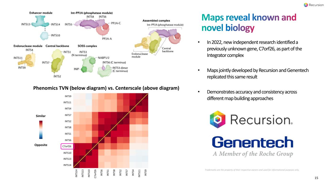 Trademarks are the property of their respective owners and used for informational purposes only. 15 INTS9 INTS11 INTS4 INTS7 INTS2 INTS8 INTS1 INTS6 C7orf26 INTS10 INTS13 INTS14 IN TS 1 4 IN TS 1 3 IN TS 1 0 C 7 o rf 2 6 IN TS 6 IN TS 1 IN TS 8 IN TS 2 IN TS 7 IN TS 4 IN TS 1 1 IN TS 9 Phenomics TVN (below diagram) vs. Centerscale (above diagram) Similar Opposite • In 2022, new independent research identified a previously unknown gene, C7orf26, as part of the Integrator complex • Maps jointly developed by Recursion and Genentech replicated this same result • Demonstrates accuracy and consistency across different map building approaches