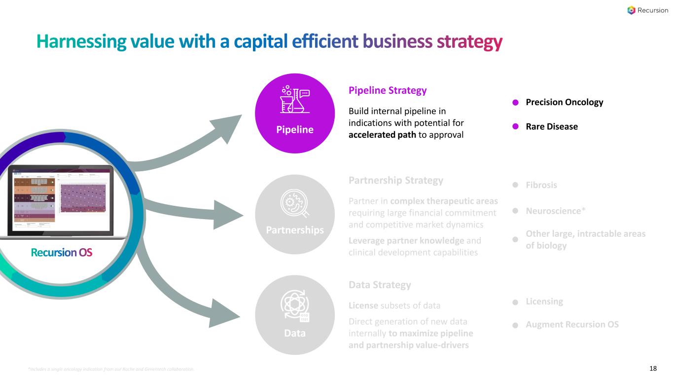 17 Pipeline Build internal pipeline in indications with potential for accelerated path to approval Pipeline Strategy Precision Oncology Rare Disease Partnerships Data Partnership Strategy Partner in complex therapeutic areas requiring large financial commitment and competitive market dynamics Leverage partner knowledge and clinical development capabilities License subsets of data Direct generation of new data internally to maximize pipeline and partnership value-drivers Data Strategy Fibrosis Other large, intractable areas of biology Neuroscience* Licensing Augment Recursion OS *Includes a single oncology indication from our Roche and Genentech collaboration.