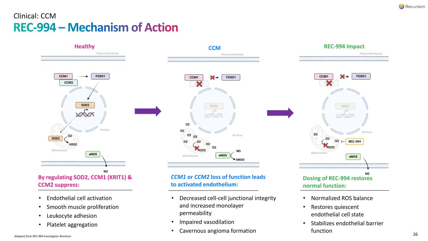 Clinical: CCM Gibson, et al. Strategy for identifying repurposed drugs for the treatment of cerebral cavernous malformation. Circulation, 2015 siCTRL siCCM2 siCCM2 + Simvastatin siCCM2 + Cholecalciferol siCCM2 + REC-994 Using an early version of our Recursion OS in an academic setting, we identified about 39 molecules out of 2,100 screened that according to a machine learning classifier rescued a complex unbiased phenotype associated with CCM2 loss of function. Through a set of follow-on confirmatory assays of increasing complexity, REC-994 stood out as one of two compounds we tested in a 5-month chronic CCM animal model where both compounds demonstrated significant benefit. 25
