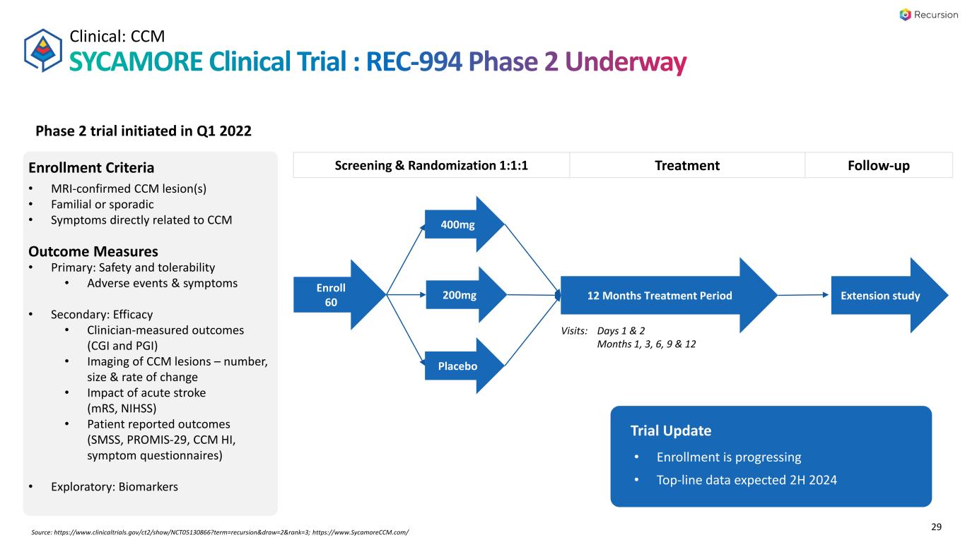 29 Phase 2 trial initiated in Q1 2022 Source: https://www.clinicaltrials.gov/ct2/show/NCT05130866?term=recursion&draw=2&rank=3; https://www.SycamoreCCM.com/ Screening & Randomization 1:1:1 Treatment Follow-up Enroll 60 400mg 200mg Placebo 12 Months Treatment Period Visits: Days 1 & 2 Months 1, 3, 6, 9 & 12 Extension study • Enrollment is progressing • Top-line data expected 2H 2024 Outcome Measures Enrollment Criteria • MRI-confirmed CCM lesion(s) • Familial or sporadic • Symptoms directly related to CCM • Primary: Safety and tolerability • Adverse events & symptoms • Secondary: Efficacy • Clinician-measured outcomes (CGI and PGI) • Imaging of CCM lesions – number, size & rate of change • Impact of acute stroke (mRS, NIHSS) • Patient reported outcomes (SMSS, PROMIS-29, CCM HI, symptom questionnaires) • Exploratory: Biomarkers Trial Update Clinical: CCM 29
