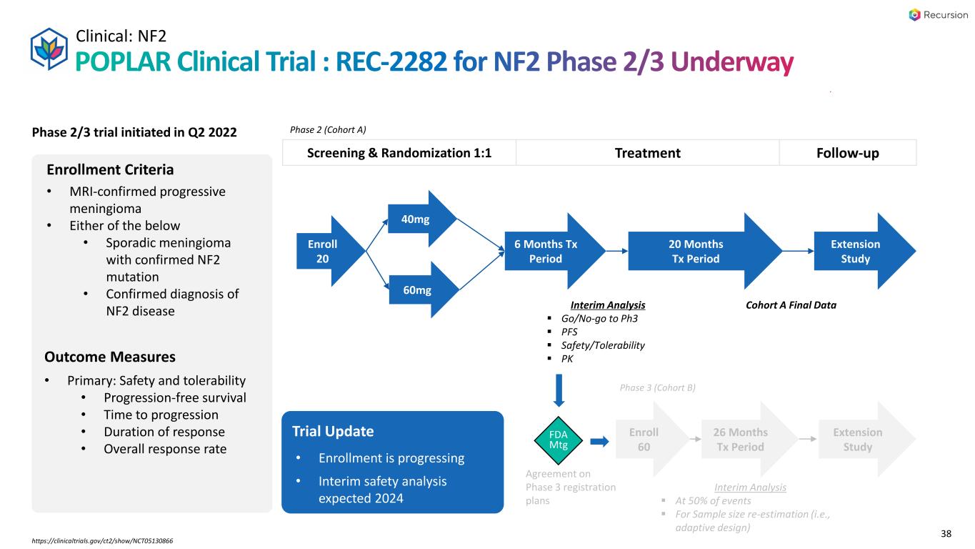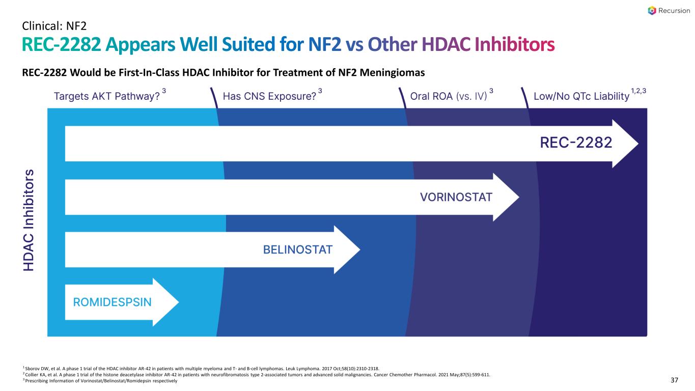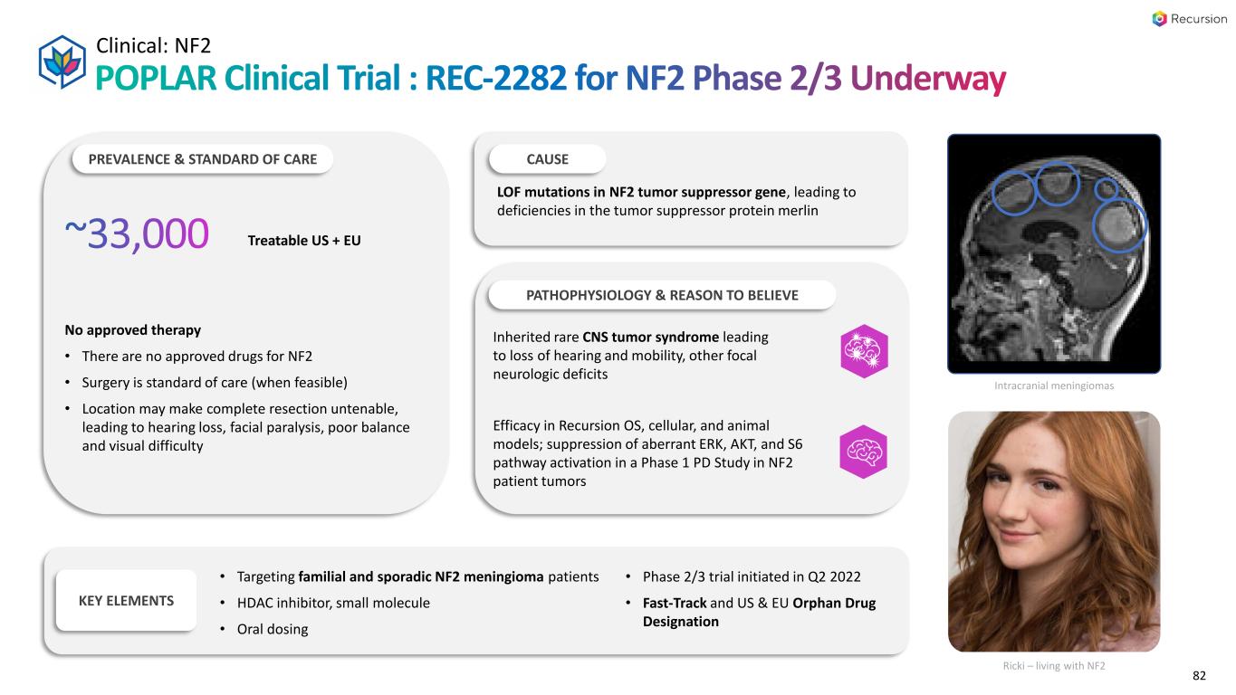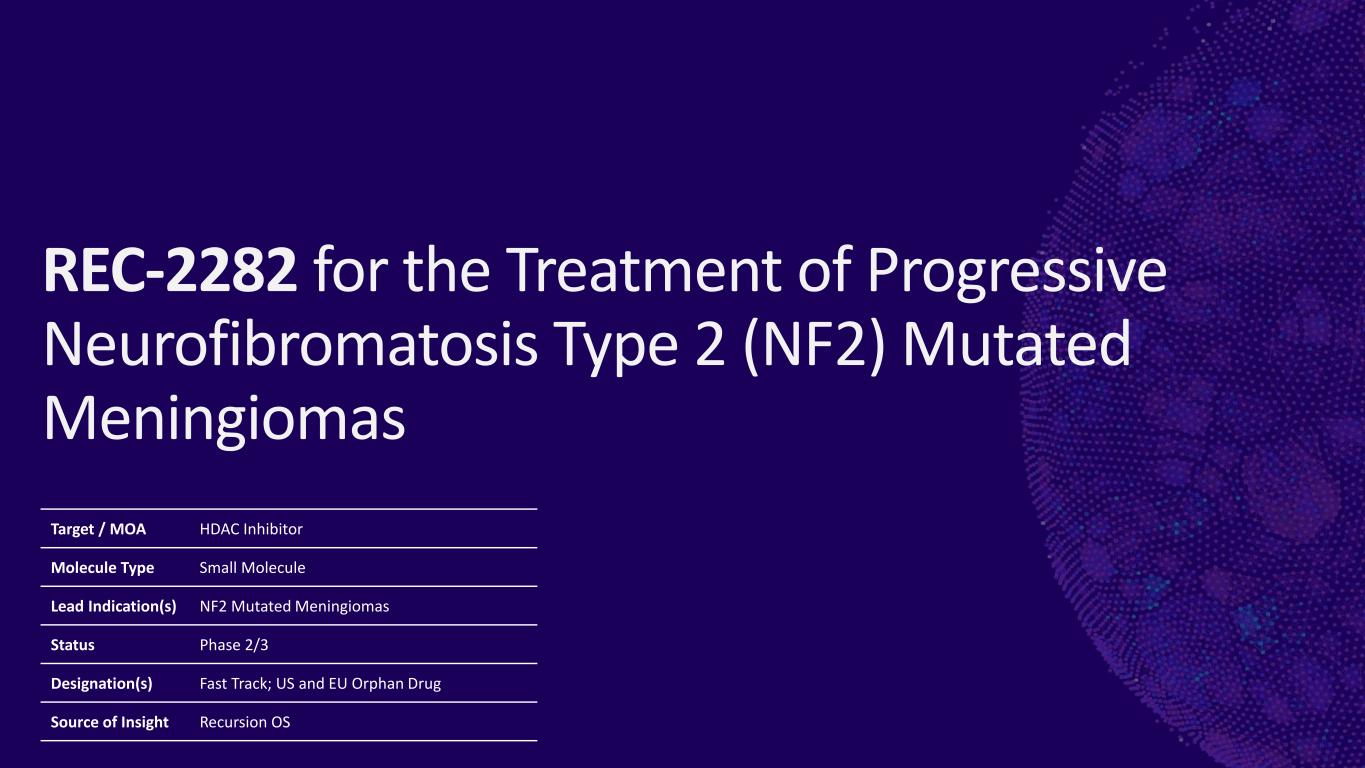 REC-2282 for the Treatment of Progressive Neurofibromatosis Type 2 (NF2) Mutated Meningiomas Target / MOA HDAC Inhibitor Molecule Type Small Molecule Lead Indication(s) NF2 Mutated Meningiomas Status Phase 2/3 Designation(s) Fast Track; US and EU Orphan Drug Source of Insight Recursion OS