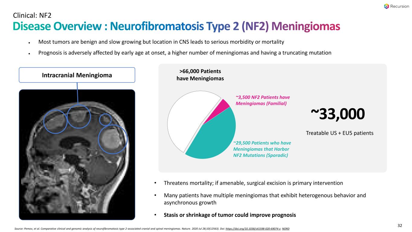 31 Source: https://rarediseases.org/rare-diseases/neurofibromatosis-2 Patient Population – Large and Diagnosable No Approved Medical Therapy • Rare autosomal dominant tumor syndrome resulting from biallelic inactivation of the NF2 gene which leads to deficiencies in the tumor suppressor protein merlin • NF2 can be inherited or spontaneous (>50% of patients represent new mutations); up to 1/3 are mosaic • CNS manifestations: meningiomas and vestibular schwannomas; mean age at presentation: ~20 years • No approved drugs for NF2 • Surgery is standard of care (when feasible) • Location may make complete resection untenable, leading to hearing loss, facial paralysis, poor balance and visual difficulty Ricki – living with NF2 Clinical: NF2 31