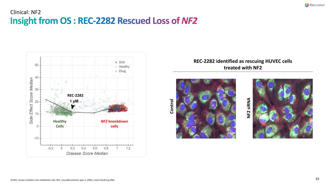 33 NF2 knockdown cells Healthy Cells REC-2282 REC-2282 identified as rescuing HUVEC cells treated with NF2 C o n tr o l N F2 s iR N A HUVEC, human umbilical vein endothelial cells; NF2, neurofibromatosis type 2; siRNA, small interfering RNA. Clinical: NF2 33