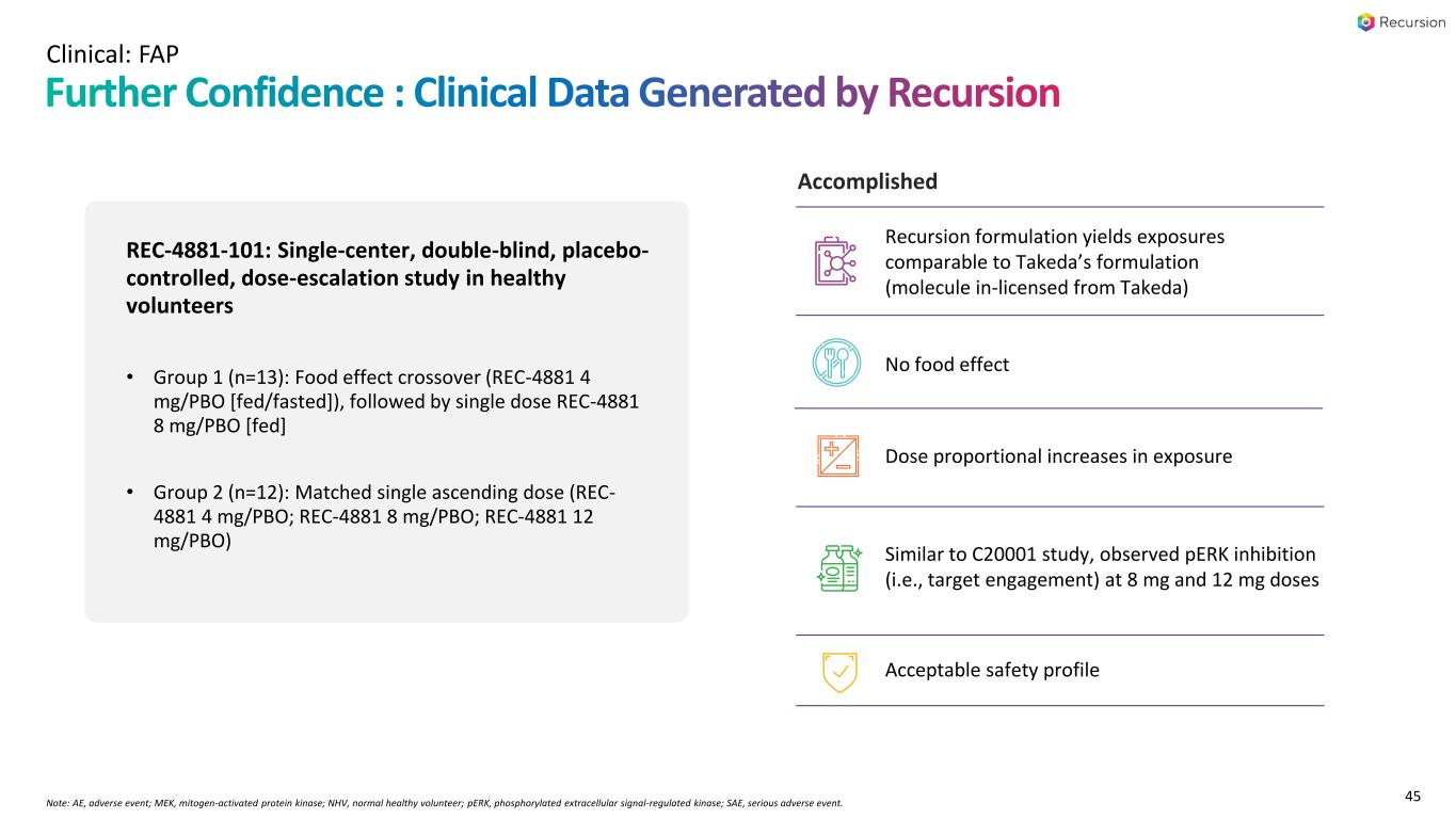 45 Note: AE, adverse event; MEK, mitogen-activated protein kinase; NHV, normal healthy volunteer; pERK, phosphorylated extracellular signal-regulated kinase; SAE, serious adverse event. REC-4881-101: Single-center, double-blind, placebo- controlled, dose-escalation study in healthy volunteers • Group 1 (n=13): Food effect crossover (REC-4881 4 mg/PBO [fed/fasted]), followed by single dose REC-4881 8 mg/PBO [fed] • Group 2 (n=12): Matched single ascending dose (REC- 4881 4 mg/PBO; REC-4881 8 mg/PBO; REC-4881 12 mg/PBO) Accomplished Clinical: FAP Recursion formulation yields exposures comparable to Takeda’s formulation (molecule in-licensed from Takeda) No food effect Dose proportional increases in exposure Similar to C20001 study, observed pERK inhibition (i.e., target engagement) at 8 mg and 12 mg doses Acceptable safety profile 45