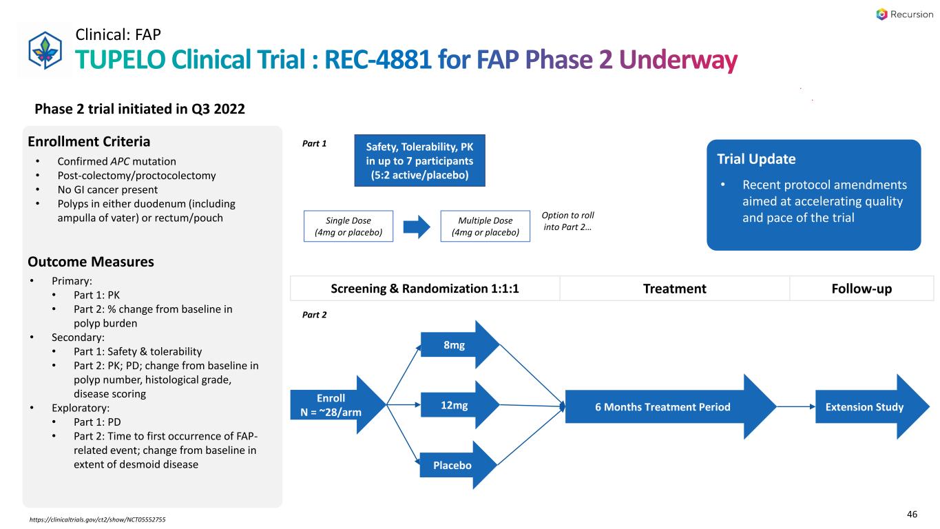 REC-4881 for the Treatment of Familial Adenomatous Polyposis (FAP) Target / MOA MEK Inhibitor Molecule Type Small Molecule Lead Indication(s) Familial Adenomatous Polyposis Status Phase 2 Designation(s) Fast Track; US and EU Orphan Drug Source of Insight Recursion OS