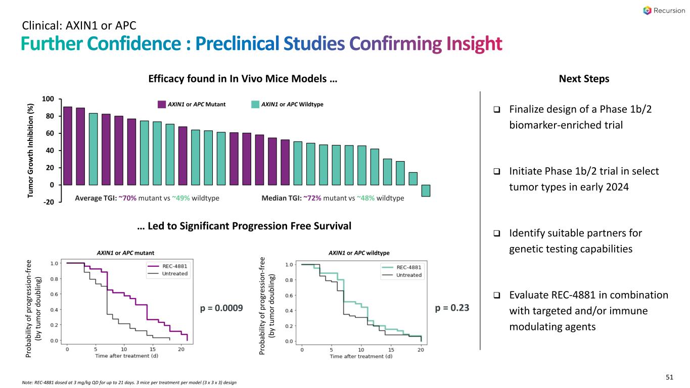 REC-4881 for the Treatment of Solid Tumors with AXIN1 or APC Mutant Cancers Target / MOA MEK Inhibitor Molecule Type Small Molecule Lead Indication(s) Solid Tumors with AXIN1 or APC Mutant Cancers Status Phase 1b/2 Source of Insight Recursion OS