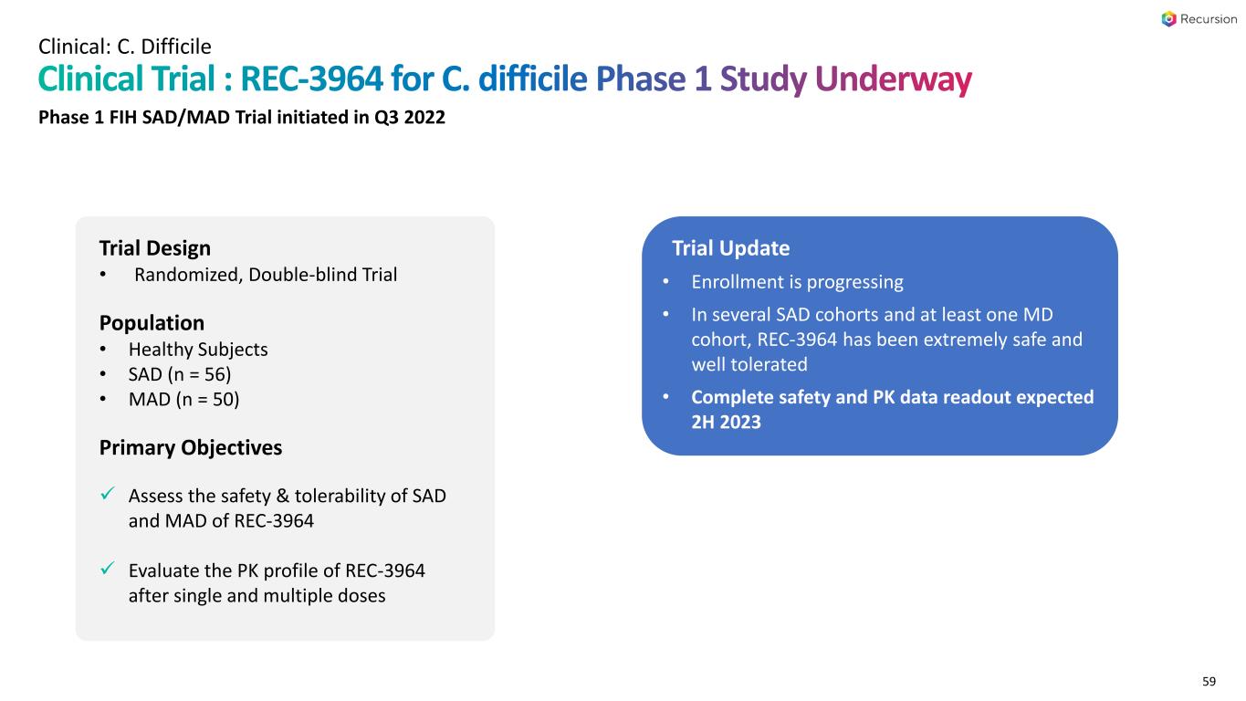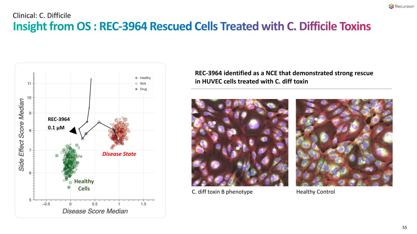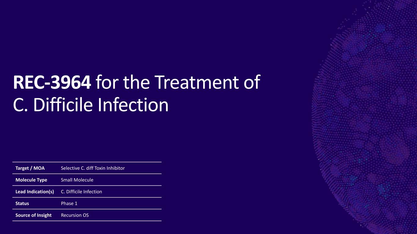 REC-3964 for the Treatment of C. Difficile Infection Target / MOA Selective C. diff Toxin Inhibitor Molecule Type Small Molecule Lead Indication(s) C. Difficile Infection Status Phase 1 Source of Insight Recursion OS