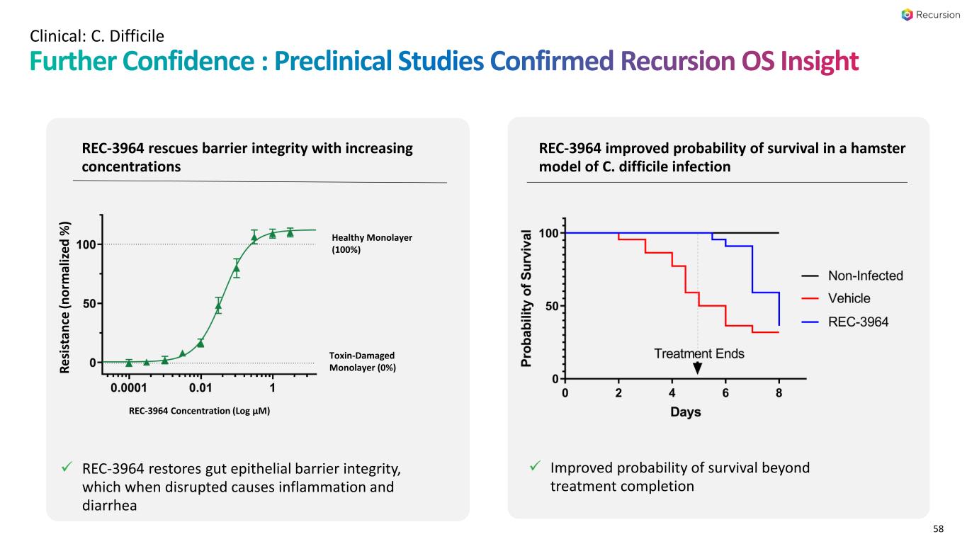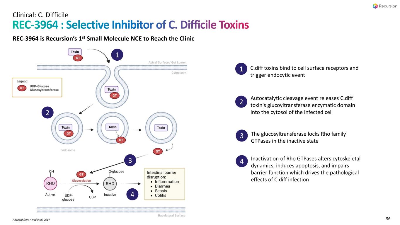 Adapted from Awad, MM. et al. (2014). Clostridium difficile virulence factors: Insights into an anaerobic spore-forming pathogen. Gut Microbes. 5(5), 579-593. Clinical: C. Difficile 3 1 2 4 REC-3964 binds and blocks catalytic activity of the toxin’s innate glucosyltransferase, but not the host's 5 5 REC-3964 is Recursion’s 1st Small Molecule NCE to Reach the Clinic 57