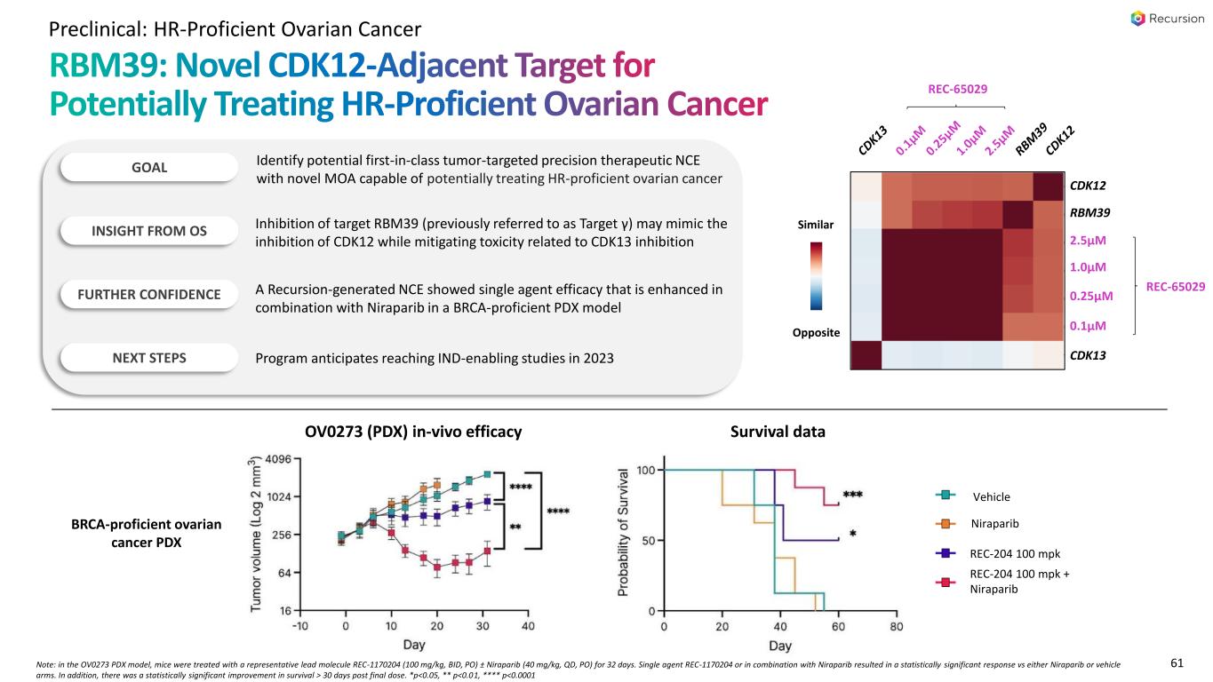 RBM39 CDK12 2.5μM 1.0μM REC-65029 0.1μM 0.25μM CDK13 REC-65029 Similar Opposite BRCA-proficient ovarian cancer PDX Preclinical: HR-Proficient Ovarian Cancer Identify potential first-in-class tumor-targeted precision therapeutic NCE with novel MOA capable of potentially treating HR-proficient ovarian cancer Inhibition of target RBM39 (previously referred to as Target γ) may mimic the inhibition of CDK12 while mitigating toxicity related to CDK13 inhibition A Recursion-generated NCE showed single agent efficacy that is enhanced in combination with Niraparib in a BRCA-proficient PDX model Program anticipates reaching IND-enabling studies in 2023 GOAL INSIGHT FROM OS FURTHER CONFIDENCE NEXT STEPS Vehicle Niraparib REC-204 100 mpk REC-204 100 mpk + Niraparib OV0273 (PDX) in-vivo efficacy Survival data Note: in the OV0273 PDX model, mice were treated with a representative lead molecule REC-1170204 (100 mg/kg, BID, PO) ± Niraparib (40 mg/kg, QD, PO) for 32 days. Single agent REC-1170204 or in combination with Niraparib resulted in a statistically significant response vs either Niraparib or vehicle arms. In addition, there was a statistically significant improvement in survival > 30 days post final dose. *p<0.05, ** p<0.01, **** p<0.0001 61