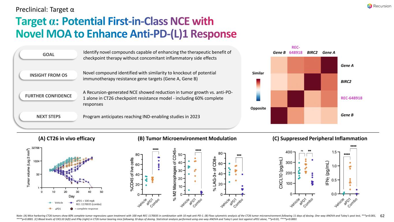 Gene B Gene B REC- 648918 REC-648918 BIRC2 Gene A Gene A BIRC2 Similar Opposite (A) CT26 in vivo efficacy Note: (A) Mice harboring CT26 tumors show 60% complete tumor regressions upon treatment with 100 mpk REC-1170035 in combination with 10 mpk anti-PD-1. (B) Flow cytometric analysis of the CT26 tumor microenvironment following 11 days of dosing. One-way ANOVA and Tukey’s post test, ***p<0.001, ****p<0.0001. (C) Blood levels of CXCL10 (left) and IFNγ (right) in CT26 tumor bearing mice following 10 days of dosing. Stat istical analysis performed using one-way ANOVA and Tukey’s post test against aPD1 alone, **p<0.01, ****p<0.0001 Preclinical: Target α GOAL INSIGHT FROM OS FURTHER CONFIDENCE NEXT STEPS Identify novel compounds capable of enhancing the therapeutic benefit of checkpoint therapy without concomitant inflammatory side effects Novel compound identified with similarity to knockout of potential immunotherapy resistance gene targets (Gene A, Gene B) A Recursion-generated NCE showed reduction in tumor growth vs. anti-PD- 1 alone in CT26 checkpoint resistance model - including 60% complete responses (B) Tumor Microenvironment Modulation (C) Suppressed Peripheral Inflammation Program anticipates reaching IND-enabling studies in 2023 62