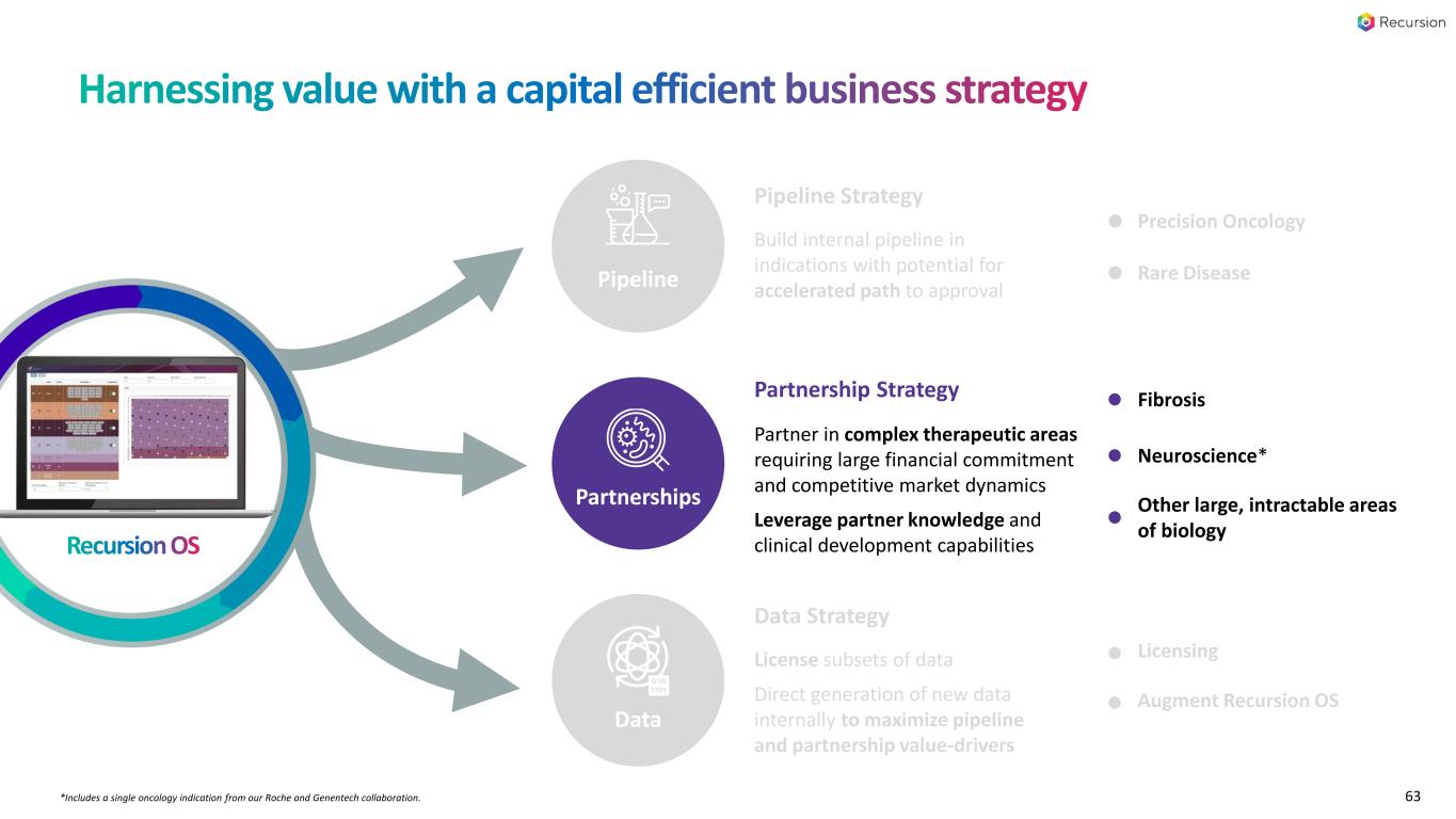 63 Partnerships Partnership Strategy Partner in complex therapeutic areas requiring large financial commitment and competitive market dynamics Leverage partner knowledge and clinical development capabilities Fibrosis Other large, intractable areas of biology Neuroscience* Pipeline Build internal pipeline in indications with potential for accelerated path to approval Pipeline Strategy Precision Oncology Rare Disease Data License subsets of data Direct generation of new data internally to maximize pipeline and partnership value-drivers Data Strategy Licensing Augment Recursion OS *Includes a single oncology indication from our Roche and Genentech collaboration.