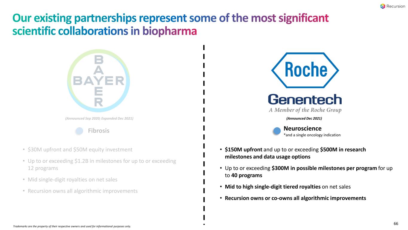 Fibrosis Neuroscience *and a single oncology indication • $30M upfront and $50M equity investment • Up to or exceeding $1.2B in milestones for up to or exceeding 12 programs • Mid single-digit royalties on net sales • Recursion owns all algorithmic improvements • $150M upfront and up to or exceeding $500M in research milestones and data usage options • Up to or exceeding $300M in possible milestones per program for up to 40 programs • Mid to high single-digit tiered royalties on net sales • Recursion owns or co-owns all algorithmic improvements (Announced Sep 2020; Expanded Dec 2021) (Announced Dec 2021) Trademarks are the property of their respective owners and used for informational purposes only. 64