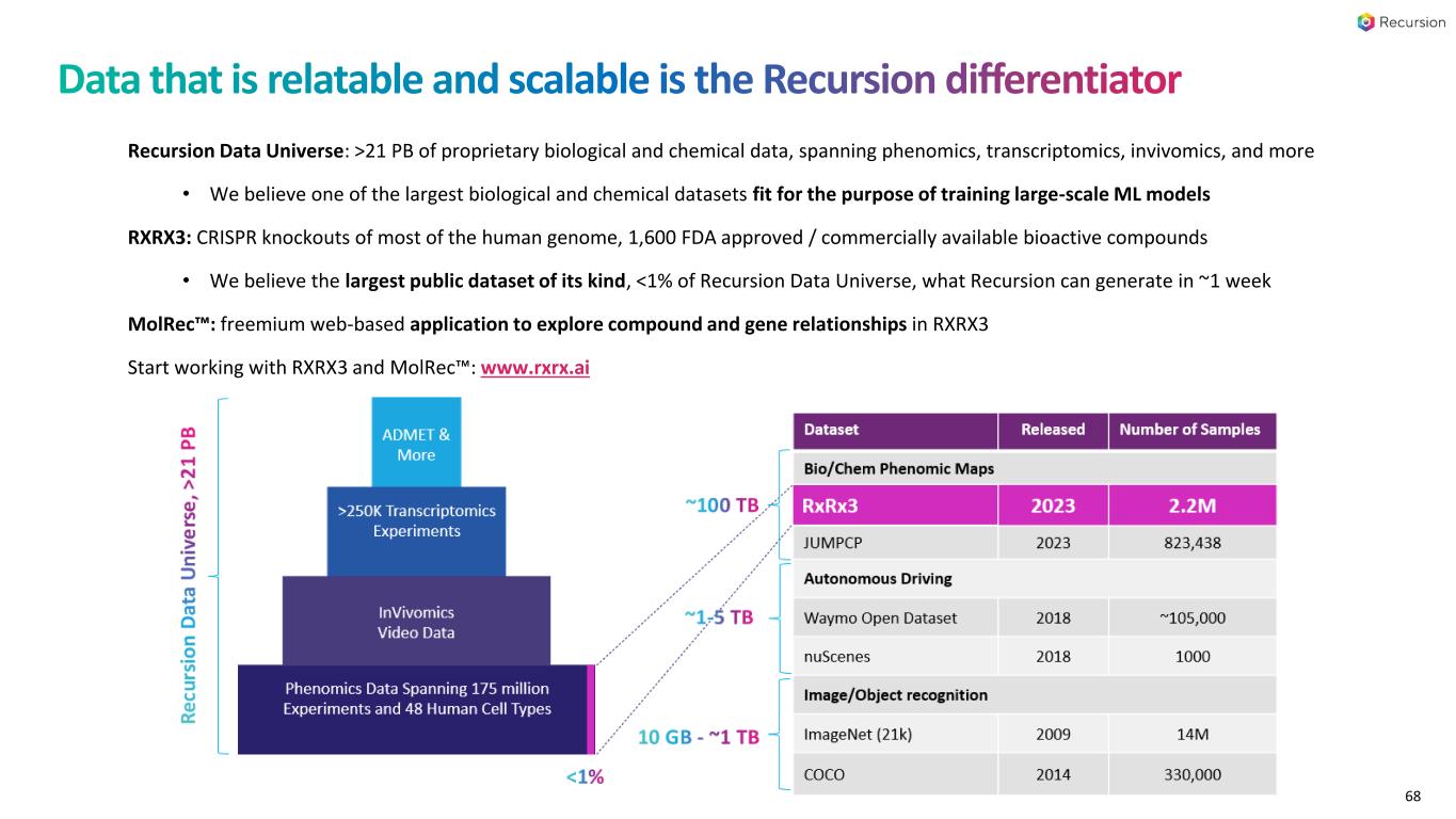 67 Partnerships Partnership Strategy Partner in complex therapeutic areas requiring large financial commitment and competitive market dynamics Leverage partner knowledge and clinical development capabilities Fibrosis Other large, intractable areas of biology Neuroscience* Pipeline Build internal pipeline in indications with potential for accelerated path to approval Pipeline Strategy Precision Oncology Rare Disease Data License subsets of data Direct generation of new data internally to maximize pipeline and partnership value-drivers Data Strategy Licensing Augment Recursion OS *Includes a single oncology indication from our Roche and Genentech collaboration.