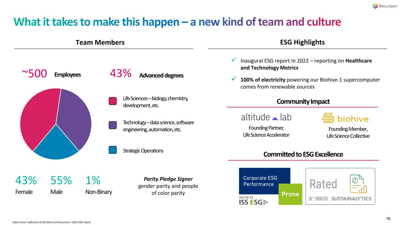 Advanced degreesEmployees Team Members ~500 43% ESG Highlights ✓ Inaugural ESG report in 2022 – reporting on Healthcare and Technology Metrics ✓ 100% of electricity powering our Biohive-1 supercomputer comes from renewable sources 43% Female Male 55% 1% Non-Binary Parity Pledge Signer gender parity and people of color parity Life Sciences –biology, chemistry, development, etc. Technology –data science, software engineering, automation, etc. Strategic Operations Community Impact Committed to ESG Excellence Founding Partner, Life Science Accelerator Founding Member, Life Science Collective 70 Data shown reflective of Q4 2022 and Recursion’s 2022 ESG report