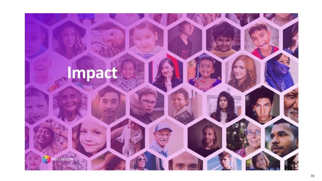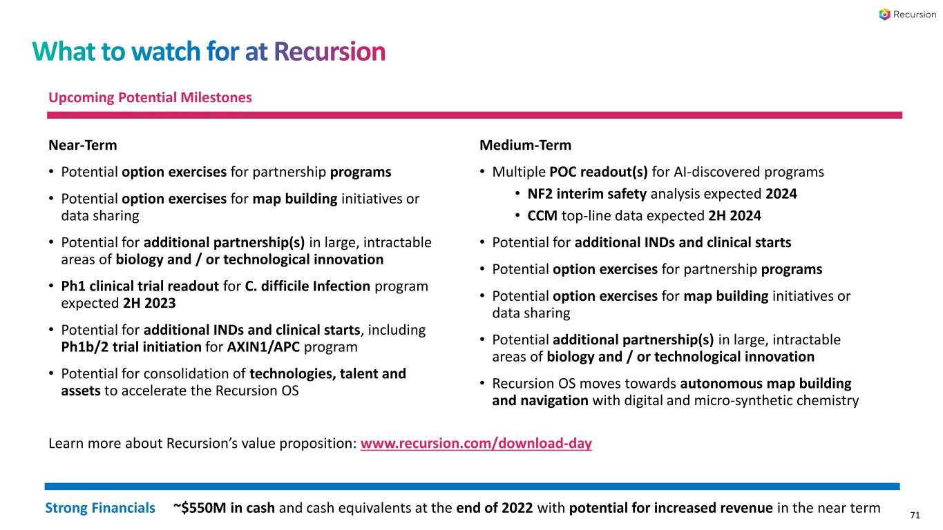 Strong Financials ~$550M in cash and cash equivalents at the end of 2022 with potential for increased revenue in the near term Near-Term • Potential option exercises for partnership programs • Potential option exercises for map building initiatives or data sharing • Potential for additional partnership(s) in large, intractable areas of biology and / or technological innovation • Ph1 clinical trial readout for C. difficile Infection program expected 2H 2023 • Potential for additional INDs and clinical starts, including Ph1b/2 trial initiation for AXIN1/APC program • Potential for consolidation of technologies, talent and assets to accelerate the Recursion OS Medium-Term • Multiple POC readout(s) for AI-discovered programs • NF2 interim safety analysis expected 2024 • CCM top-line data expected 2H 2024 • Potential for additional INDs and clinical starts • Potential option exercises for partnership programs • Potential option exercises for map building initiatives or data sharing • Potential additional partnership(s) in large, intractable areas of biology and / or technological innovation • Recursion OS moves towards autonomous map building and navigation with digital and micro-synthetic chemistry Upcoming Potential Milestones 71 Learn more about Recursion’s value proposition: www.recursion.com/download-day
