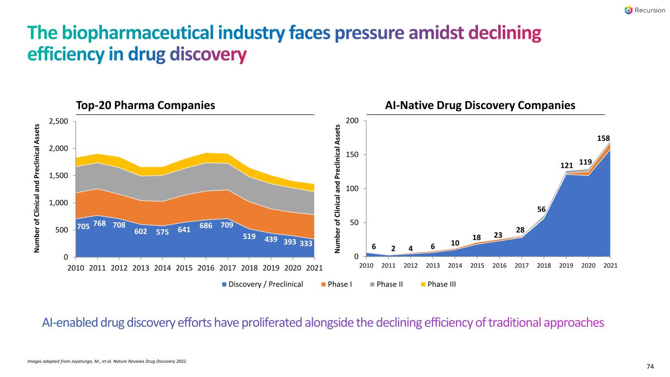Images adapted from Jayatunga, M., et al. Nature Reviews Drug Discovery 2022. 74 Top-20 Pharma Companies AI-Native Drug Discovery Companies 705 768 708 602 575 641 686 709 519 439 393 333 0 500 1,000 1,500 2,000 2,500 2010 2011 2012 2013 2014 2015 2016 2017 2018 2019 2020 2021 Discovery / Preclinical Phase I Phase II Phase III 6 2 4 6 10 18 23 28 56 121 119 158 0 50 100 150 200 2010 2011 2012 2013 2014 2015 2016 2017 2018 2019 2020 2021 N u m b er o f C lin ic al a n d P re cl in ic al A ss e ts N u m b er o f C lin ic al a n d P re cl in ic al A ss e ts