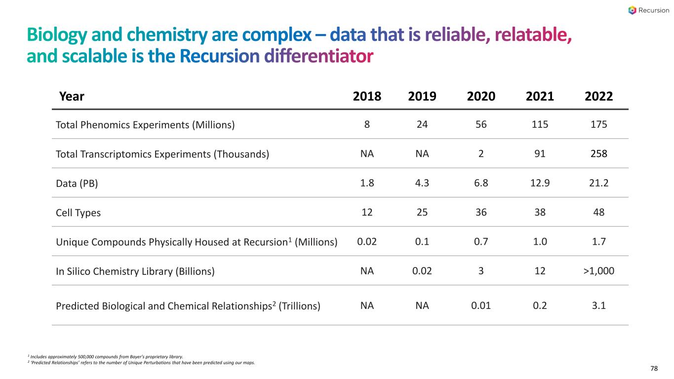 1 Includes approximately 500,000 compounds from Bayer’s proprietary library. 2 ‘Predicted Relationships’ refers to the number of Unique Perturbations that have been predicted using our maps. 78 Year 2018 2019 2020 2021 2022 Total Phenomics Experiments (Millions) 8 24 56 115 175 Total Transcriptomics Experiments (Thousands) NA NA 2 91 258 Data (PB) 1.8 4.3 6.8 12.9 21.2 Cell Types 12 25 36 38 48 Unique Compounds Physically Housed at Recursion1 (Millions) 0.02 0.1 0.7 1.0 1.7 In Silico Chemistry Library (Billions) NA 0.02 3 12 >1,000 Predicted Biological and Chemical Relationships2 (Trillions) NA NA 0.01 0.2 3.1