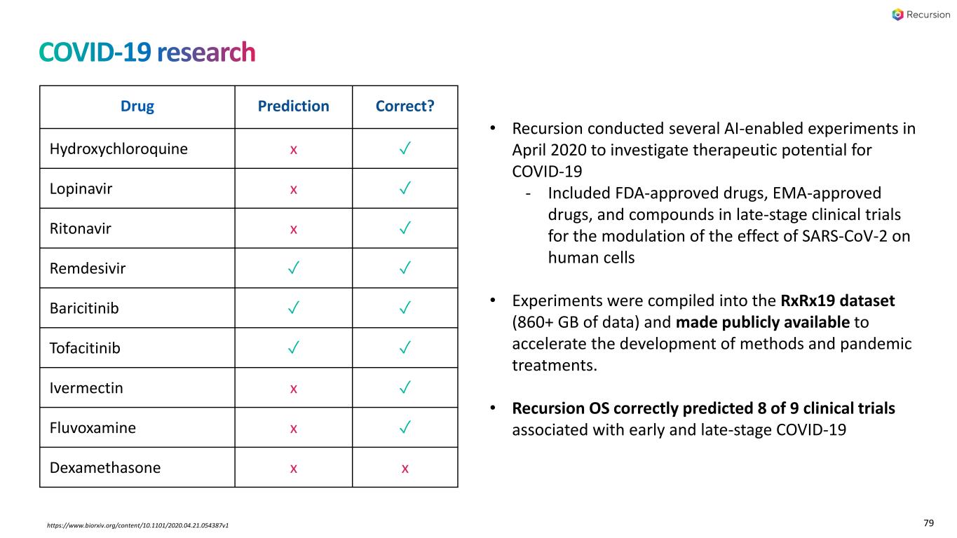 Drug Prediction Correct? Hydroxychloroquine x ✓ Lopinavir x ✓ Ritonavir x ✓ Remdesivir ✓ ✓ Baricitinib ✓ ✓ Tofacitinib ✓ ✓ Ivermectin x ✓ Fluvoxamine x ✓ Dexamethasone x x 79https://www.biorxiv.org/content/10.1101/2020.04.21.054387v1 • Recursion conducted several AI-enabled experiments in April 2020 to investigate therapeutic potential for COVID-19 - Included FDA-approved drugs, EMA-approved drugs, and compounds in late-stage clinical trials for the modulation of the effect of SARS-CoV-2 on human cells • Experiments were compiled into the RxRx19 dataset (860+ GB of data) and made publicly available to accelerate the development of methods and pandemic treatments. • Recursion OS correctly predicted 8 of 9 clinical trials associated with early and late-stage COVID-19