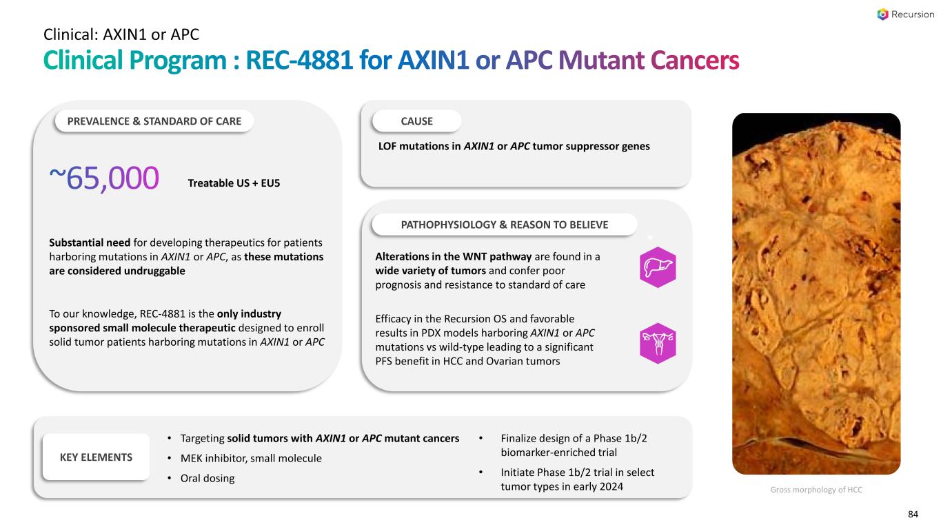 84 LOF mutations in AXIN1 or APC tumor suppressor genes PATHOPHYSIOLOGY & REASON TO BELIEVE Alterations in the WNT pathway are found in a wide variety of tumors and confer poor prognosis and resistance to standard of care Substantial need for developing therapeutics for patients harboring mutations in AXIN1 or APC, as these mutations are considered undruggable Treatable US + EU5 PREVALENCE & STANDARD OF CARE CAUSE Efficacy in the Recursion OS and favorable results in PDX models harboring AXIN1 or APC mutations vs wild-type leading to a significant PFS benefit in HCC and Ovarian tumors Gross morphology of HCC KEY ELEMENTS • Targeting solid tumors with AXIN1 or APC mutant cancers • MEK inhibitor, small molecule • Oral dosing • Finalize design of a Phase 1b/2 biomarker-enriched trial • Initiate Phase 1b/2 trial in select tumor types in early 2024 To our knowledge, REC-4881 is the only industry sponsored small molecule therapeutic designed to enroll solid tumor patients harboring mutations in AXIN1 or APC Clinical: AXIN1 or APC
