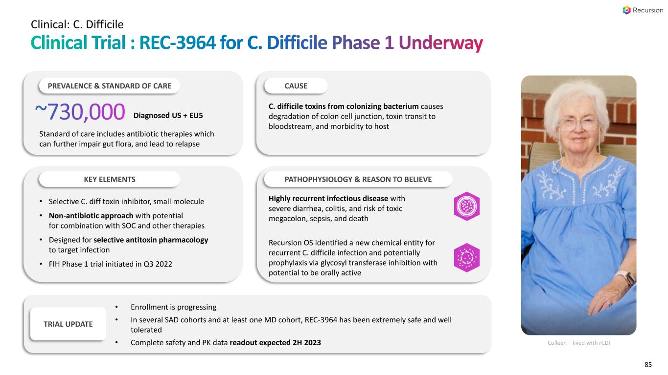 85 Colleen – lived with rCDI C. difficile toxins from colonizing bacterium causes degradation of colon cell junction, toxin transit to bloodstream, and morbidity to host PATHOPHYSIOLOGY & REASON TO BELIEVE Highly recurrent infectious disease with severe diarrhea, colitis, and risk of toxic megacolon, sepsis, and death Diagnosed US + EU5 PREVALENCE & STANDARD OF CARE CAUSE Recursion OS identified a new chemical entity for recurrent C. difficile infection and potentially prophylaxis via glycosyl transferase inhibition with potential to be orally active KEY ELEMENTS • Enrollment is progressing • In several SAD cohorts and at least one MD cohort, REC-3964 has been extremely safe and well tolerated • Complete safety and PK data readout expected 2H 2023 • Selective C. diff toxin inhibitor, small molecule • Non-antibiotic approach with potential for combination with SOC and other therapies • Designed for selective antitoxin pharmacology to target infection • FIH Phase 1 trial initiated in Q3 2022 TRIAL UPDATE Standard of care includes antibiotic therapies which can further impair gut flora, and lead to relapse Clinical: C. Difficile
