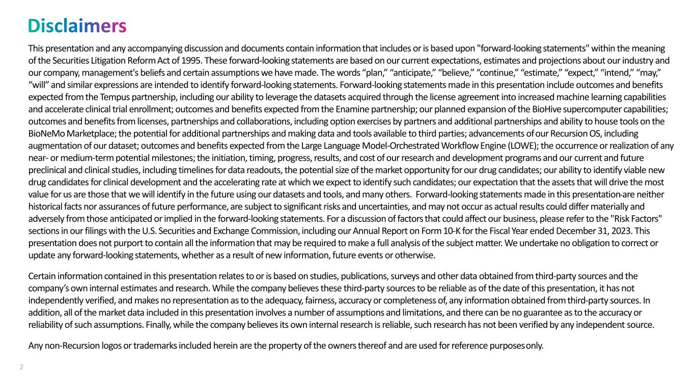 Disclaimers This presentation and any accompanying discussion and documents contain information that includes or is based upon "forward-looking statements" within the meaning of the Securities Litigation Reform Act of 1995. These forward-looking statements are based on our current expectations, estimates and projections about our industry and our company, management's beliefs and certain assumptions we have made. The words “plan,” “anticipate,” “believe,” “continue,” “estimate,” “expect,” “intend,” “may,” “will” and similar expressions are intended to identify forward-looking statements. Forward-looking statements made in this presentation include outcomes and benefits expected from the Tempus partnership, including our ability to leverage the datasets acquired through the license agreement into increased machine learning capabilities and accelerate clinical trial enrollment; outcomes and benefits expected from the Enamine partnership; our planned expansion of the BioHive supercomputer capabilities; outcomes and benefits from licenses, partnerships and collaborations, including option exercises by partners and additional partnerships and ability to house tools on the BioNeMo Marketplace; the potential for additional partnerships and making data and tools available to third parties; advancements of our Recursion OS, including augmentation of our dataset; outcomes and benefits expected from the Large Language Model-Orchestrated Workflow Engine (LOWE); the occurrence or realization of any near- or medium-term potential milestones; the initiation, timing, progress, results, and cost of our research and development programs and our current and future preclinical and clinical studies, including timelines for data readouts, the potential size of the market opportunity for our drug candidates; our ability to identify viable new drug candidates for clinical development and the accelerating rate at which we expect to identify such candidates; our expectation that the assets that will drive the most value for us are those that we will identify in the future using our datasets and tools, and many others. Forward-looking statements made in this presentation are neither historical facts nor assurances of future performance, are subject to significant risks and uncertainties, and may not occur as actual results could differ materially and adversely from those anticipated or implied in the forward-looking statements. For a discussion of factors that could affect our business, please refer to the "Risk Factors" sections in our filings with the U.S. Securities and Exchange Commission, including our Annual Report on Form 10-K for the Fiscal Year ended December 31, 2023. This presentation does not purport to contain all the information that may be required to make a full analysis of the subject matter. We undertake no obligation to correct or update any forward-looking statements, whether as a result of new information, future events or otherwise. Certain information contained in this presentation relates to or is based on studies, publications, surveys and other data obtained from third-party sources and the company’s own internal estimates and research. While the company believes these third-party sources to be reliable as of the date of this presentation, it has not independently verified, and makes no representation as to the adequacy, fairness, accuracy or completeness of, any information obtained from third-party sources. In addition, all of the market data included in this presentation involves a number of assumptions and limitations, and there can be no guarantee as to the accuracy or reliability of such assumptions. Finally, while the company believes its own internal research is reliable, such research has not been verified by any independent source. Any non-Recursion logos or trademarks included herein are the property of the owners thereof and are used for reference purposes only. 2